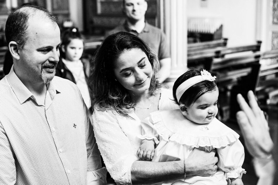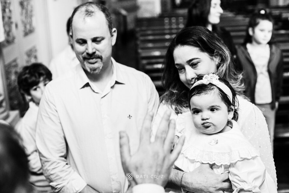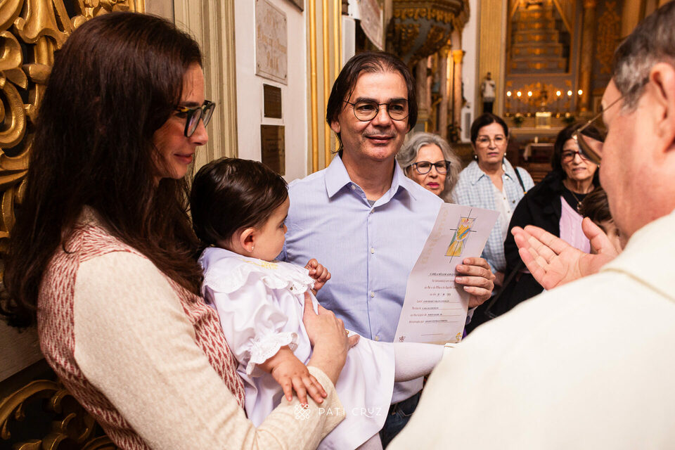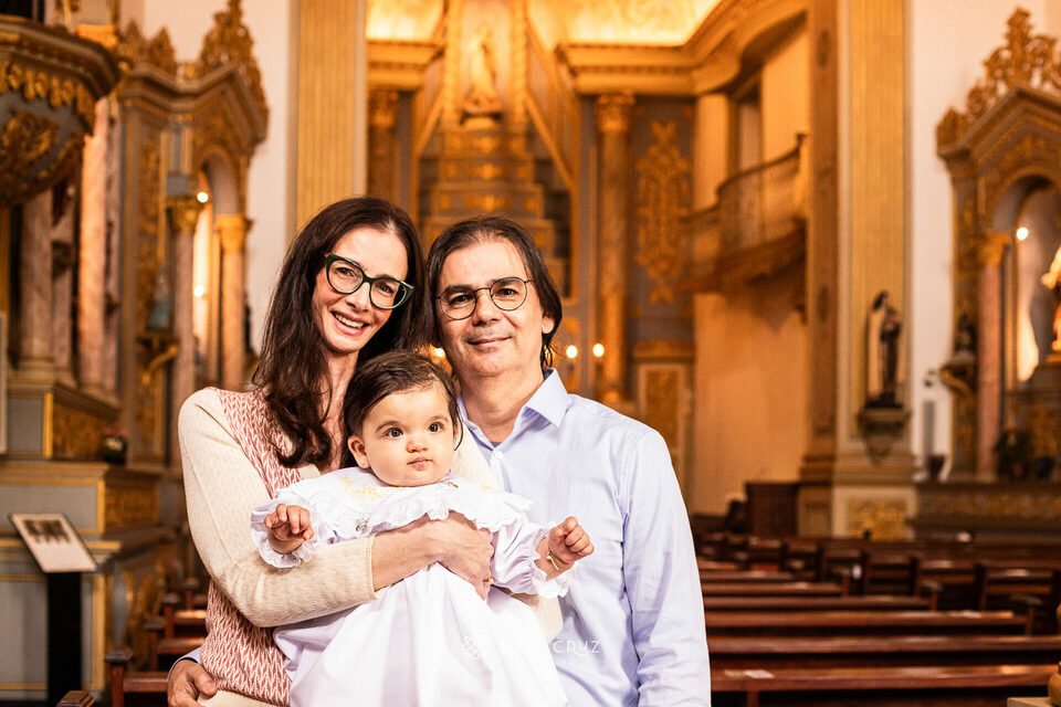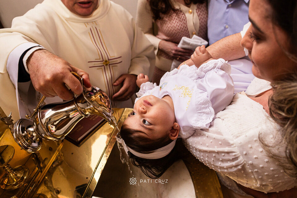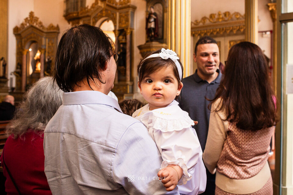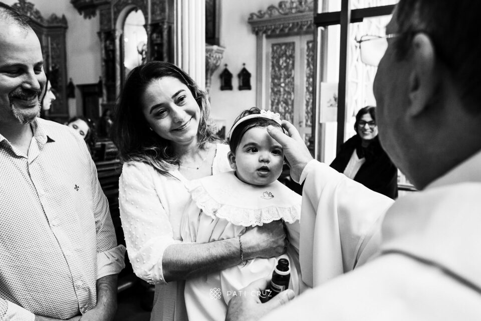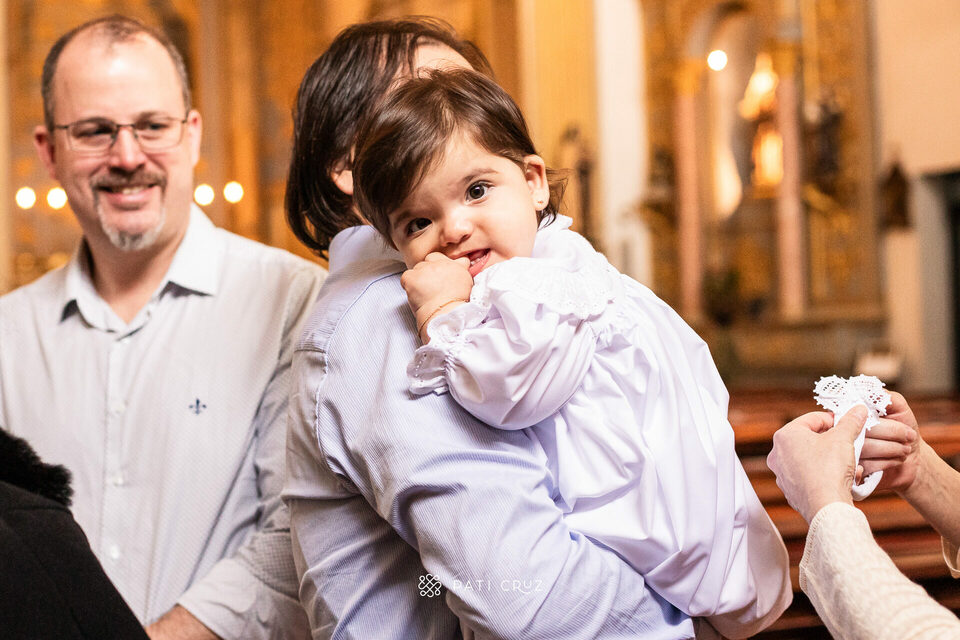 O batizado da Camila aconteceu na Paróquia Nossa Senhora da Conceição, em Porto Alegre, logo após a tradicional missa dominical. Assim que a igreja esvaziou, ficaram ali os familiares da pequena Camila, que foram convidados a se aproximar para dar início a cerimônia. Camila estava atenta, observando tudo o que acontecia, inclusive a mim que registrava a ocasião. Vestida com um vestido branco longo, de mangas bufantes, bordado a mão por sua mãe, com detalhes em rendas e broderis, a pequena parecia um verdadeiro anjinho.