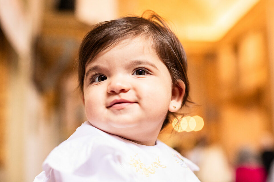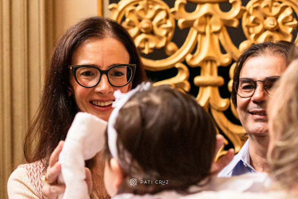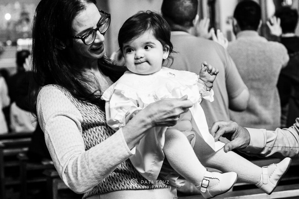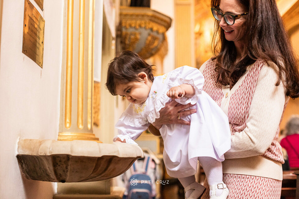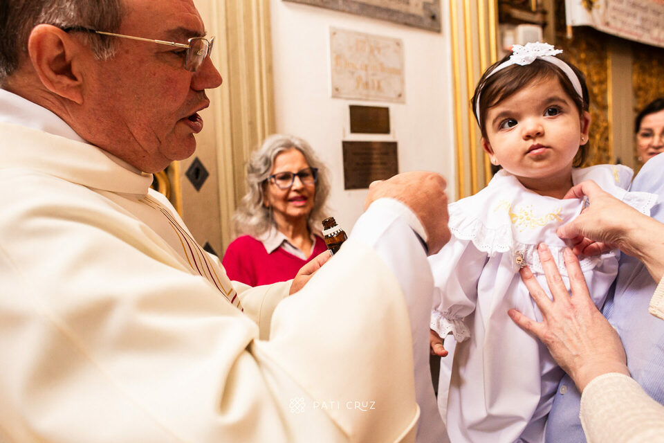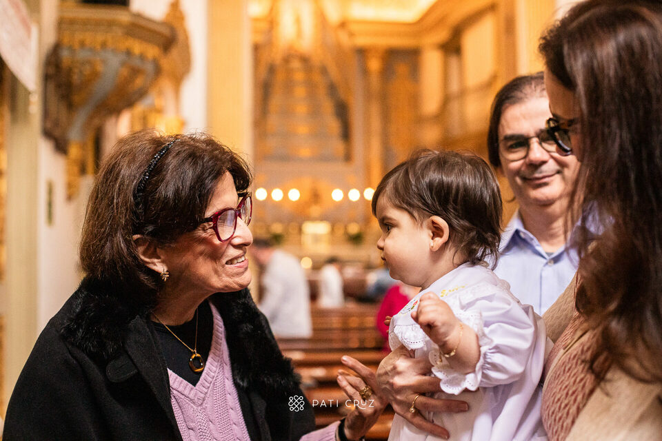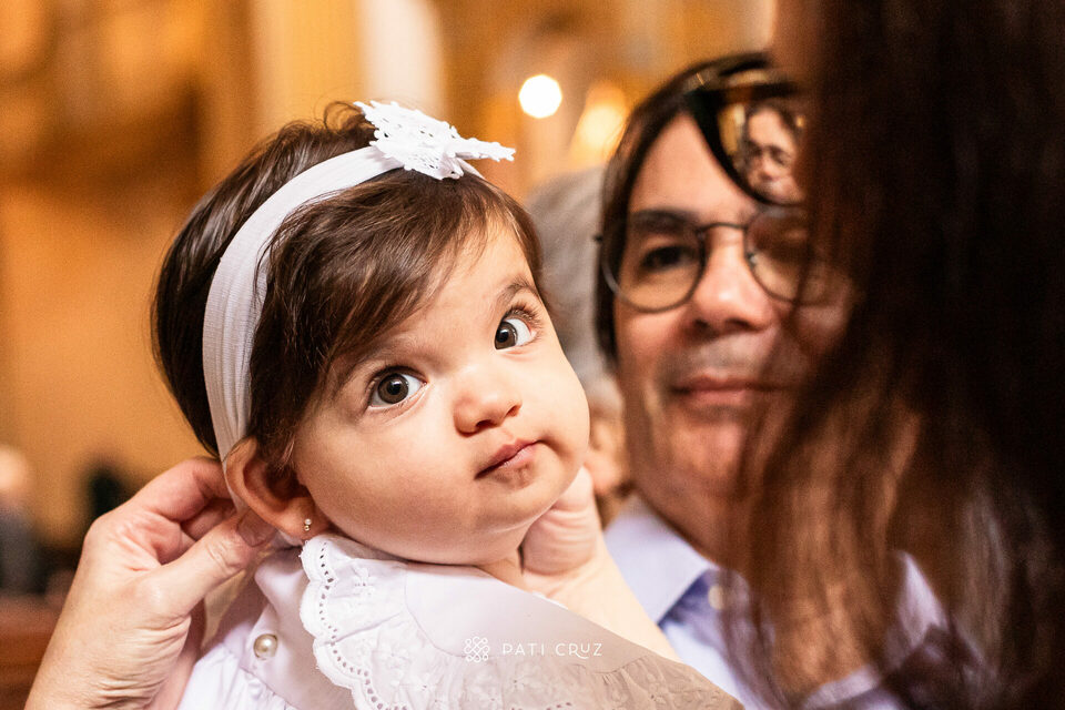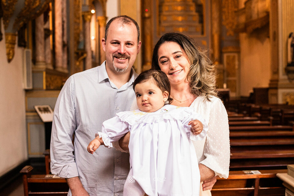 O batizado da Camila aconteceu na Paróquia Nossa Senhora da Conceição, em Porto Alegre, logo após a tradicional missa dominical. Assim que a igreja esvaziou, ficaram ali os familiares da pequena Camila, que foram convidados a se aproximar para dar início a cerimônia. Camila estava atenta, observando tudo o que acontecia, inclusive a mim que registrava a ocasião. Vestida com um vestido branco longo, de mangas bufantes, bordado a mão por sua mãe, com detalhes em rendas e broderis, a pequena parecia um verdadeiro anjinho.