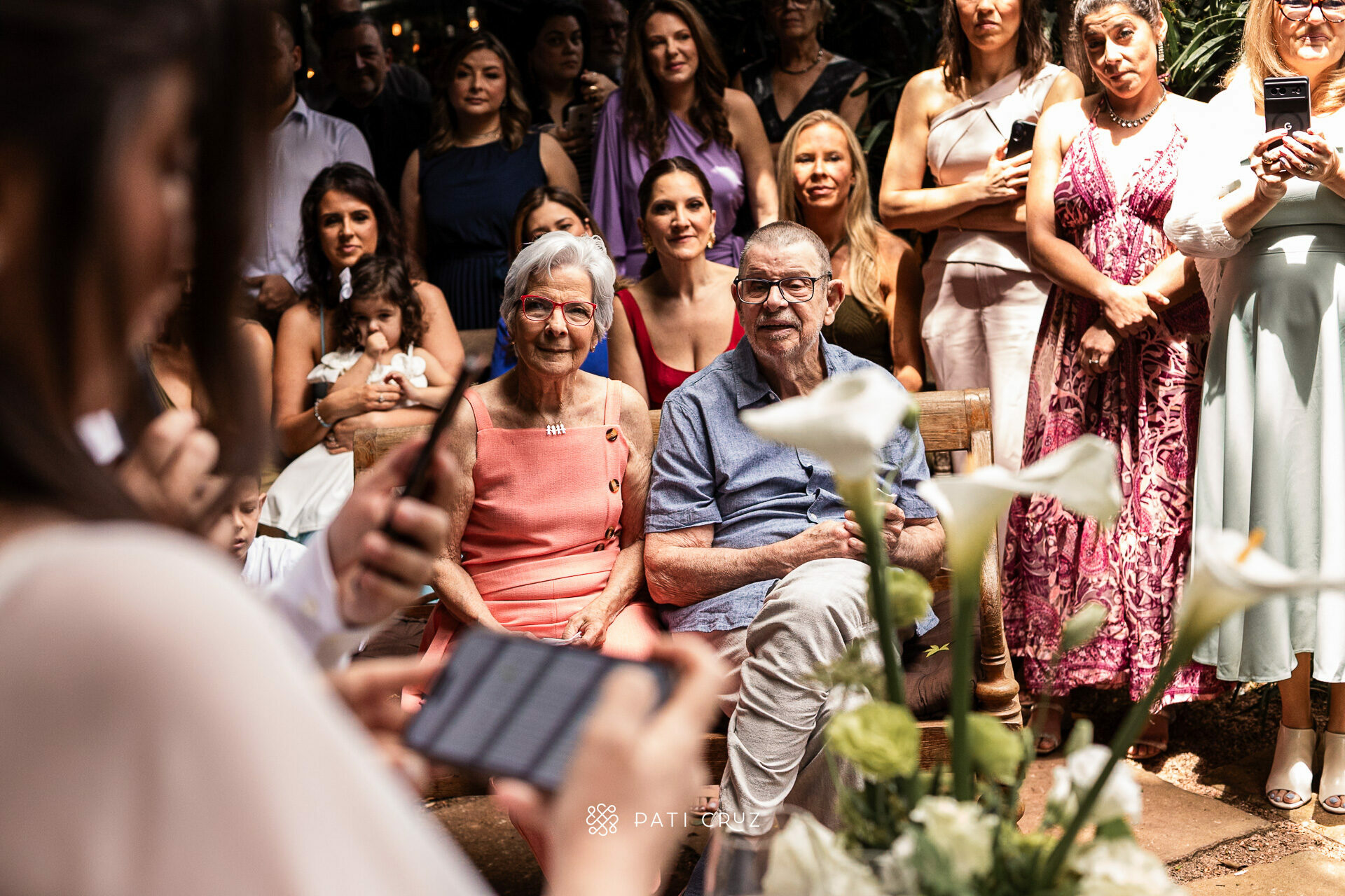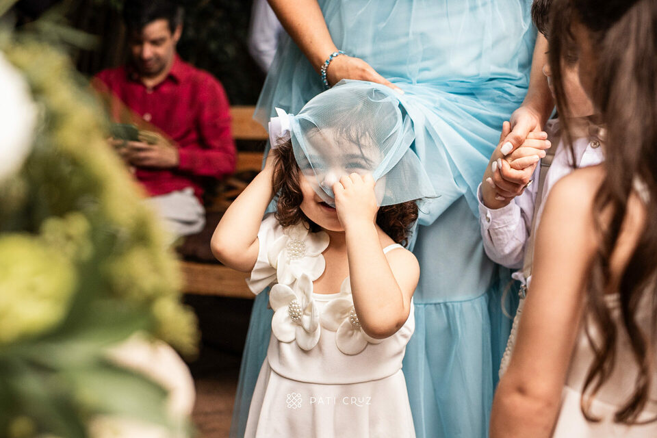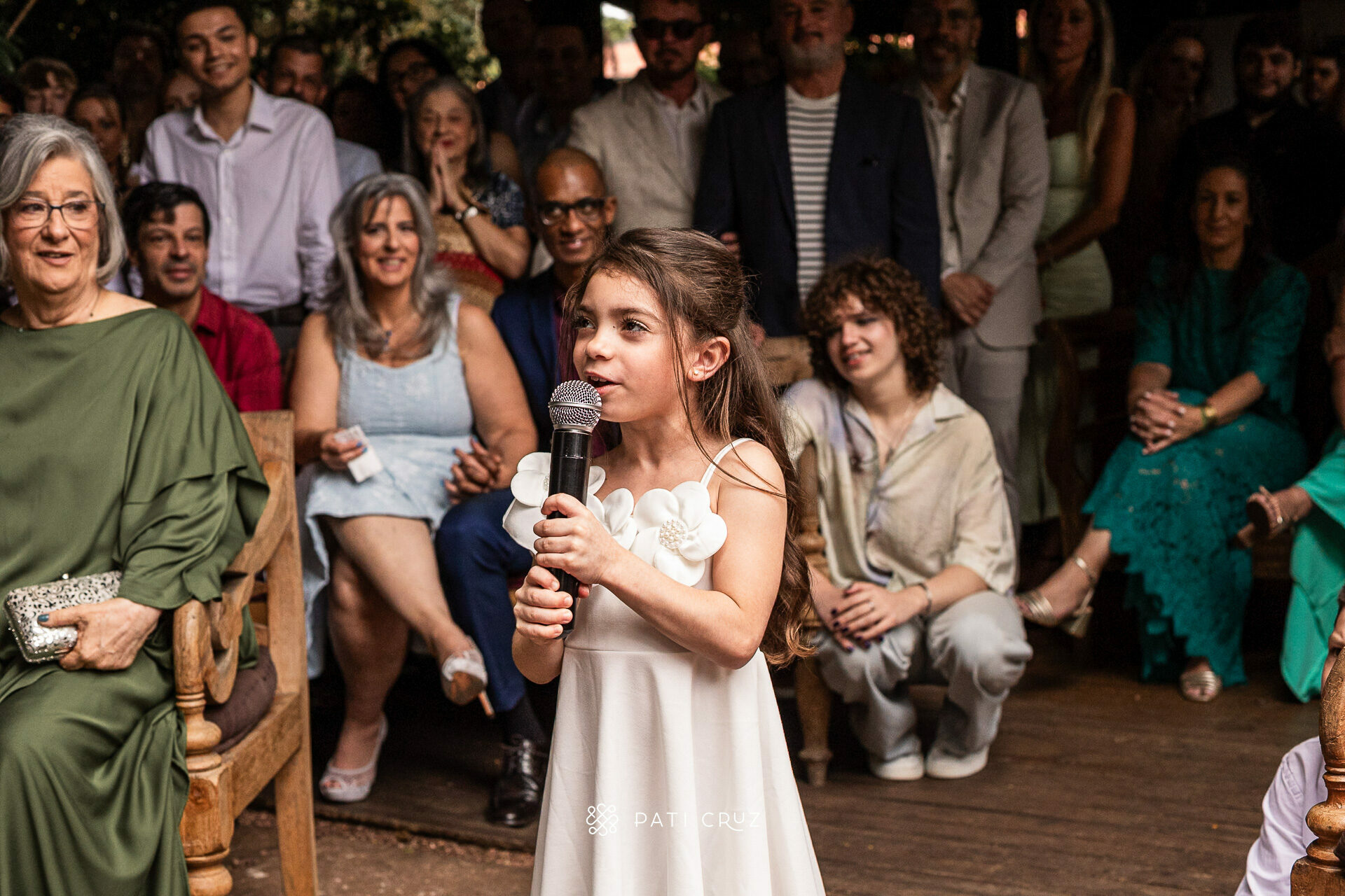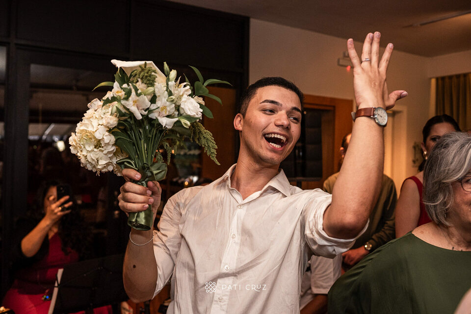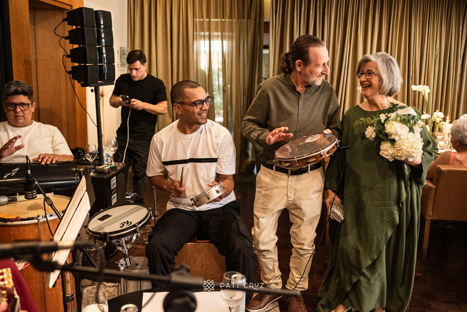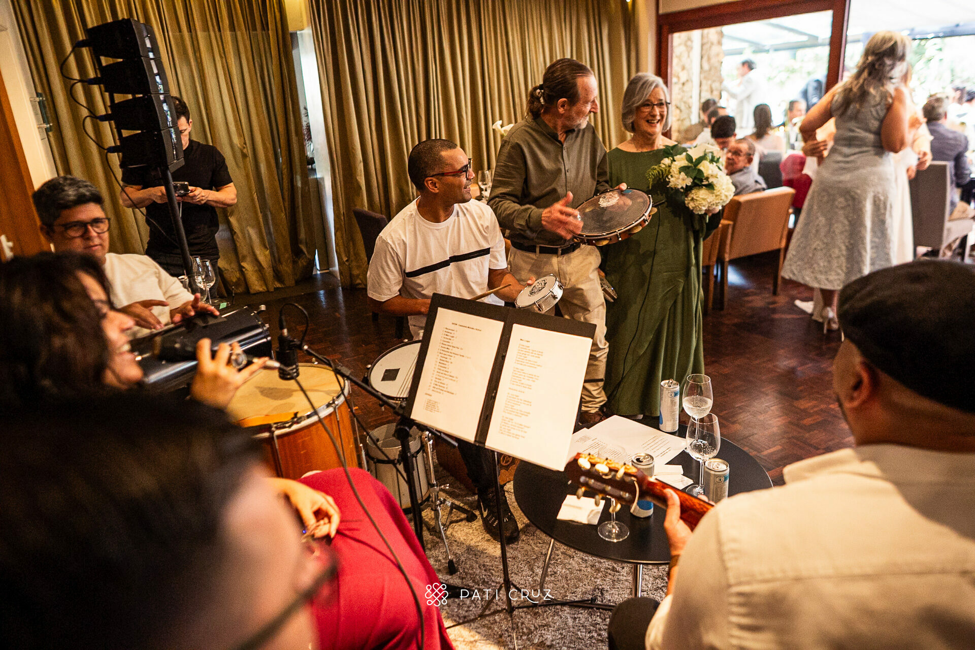 Ela optou por não entrar com buquê. Tanto ela quanto os padrinhos entraram segurando uma única flor, e todas essas flores foram transformadas no buquê pela madrinha de batismo da Michelle. Música é algo muito importante para ela, e uma de suas amigas e madrinhas, a Anaadi, cantora e compositora, mesmo morando atualmente na França, veio para o casamento. Junto com sua banda, garantiu a animação da festa. O pai da Miche também se aventurou no pandeiro e arrasou.