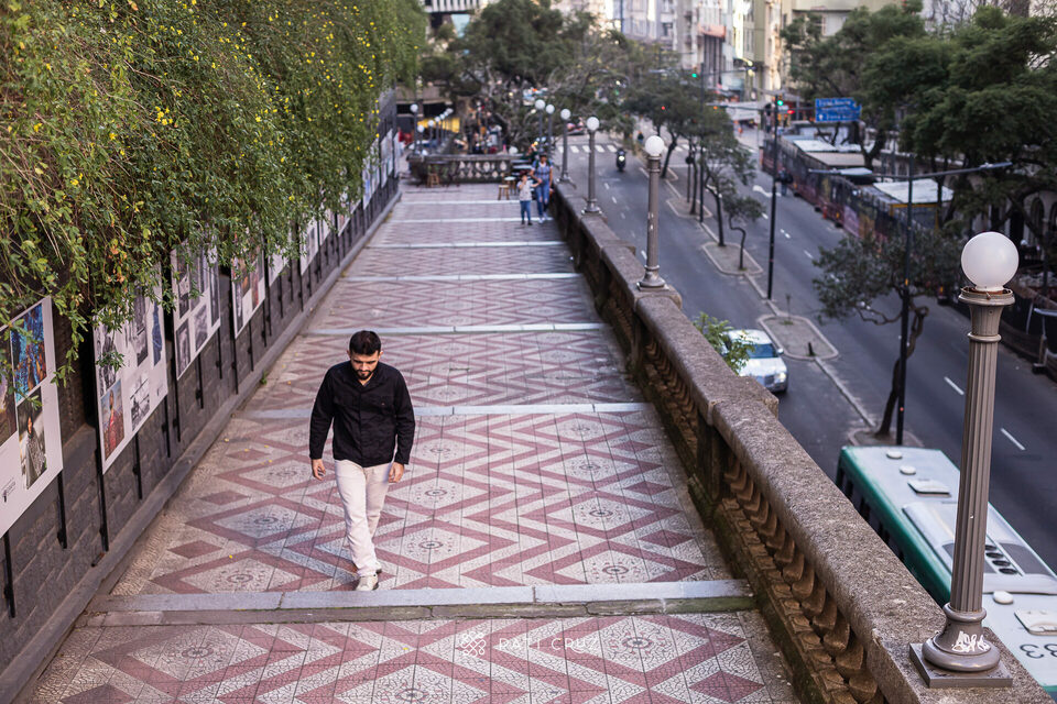 Iniciamos as fotos na travessa dos venezianos. De lá, fotografamos em alguns grafites que encontramos pelas ruas da cidade baixa, passamos pela João Alfredo, clássica rua boêmia da cidade, seguimos para a ponte de pedra e monumento aos açorianos. Já no centro histórico, fizemos algumas fotos no viaduto Otavio Rocha, também conhecido como viaduto da Borges de Medeiros, passamos em frente a catedral e ao teatro São Pedro e chegamos na Casa de Cultura Mário Quintana, local onde eu ainda não havia fotografado mas que tem um lugarzinho especial no meu coração por ter sido projetado pelo meu tataravô, Theo Wiederspahn. Após mais alguns cliques e uma pausa rápida para uma água, seguimos para a última etapa do nosso roteiro, junto a orla do Guaíba, ao pôr-do-sol: Cais Embarcadeiro e Usina do Gasômetro. Passamos uma tarde agradável, de muita caminhada, conversa boa, cliques e um pouquinho (bem pouquinho) da história da cidade. Fui embora com o desejo de que venham muitos outros clientes, turistas ou não, querendo explorar registros lindos aqui na nossa capital gaúcha.