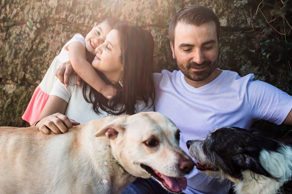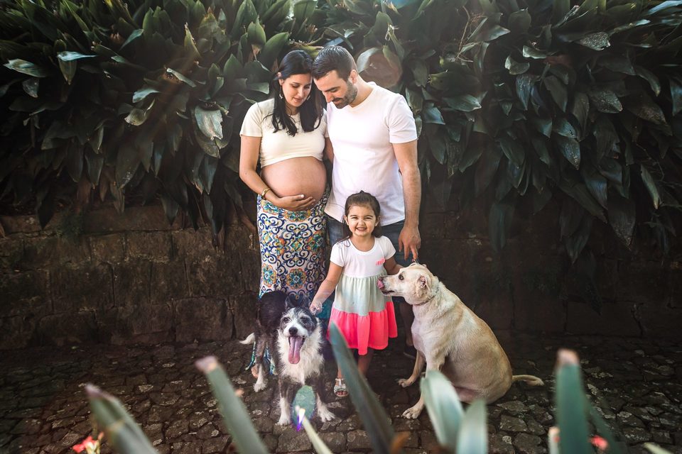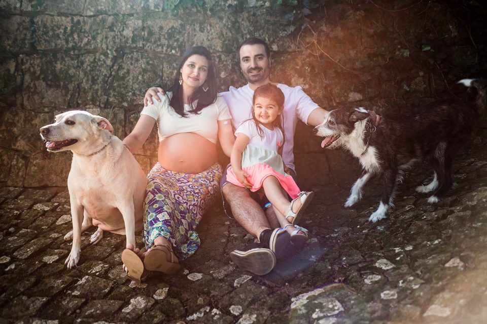 Eu tenho 35 anos, sou casada com o Felipe e estamos juntos há 14 anos. Começamos a família com o Dog Ziggy, nosso filho canino que hoje tem 10 anos e é um vira lata de porte M. Logo depois adotamos a Lua que hoje está com 6 anos ( vira lata porte G ). Depois veio a Helena que hoje está com 3 anos e agora quem está a caminho é a Joana.