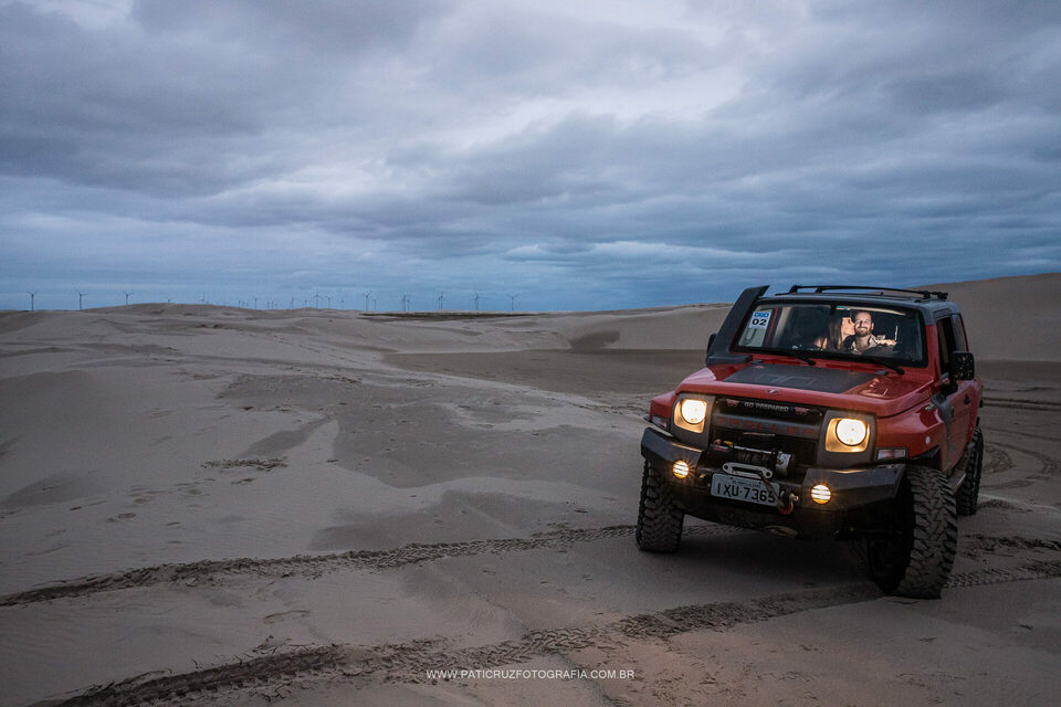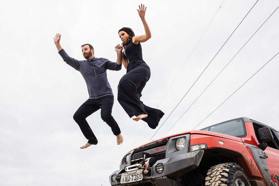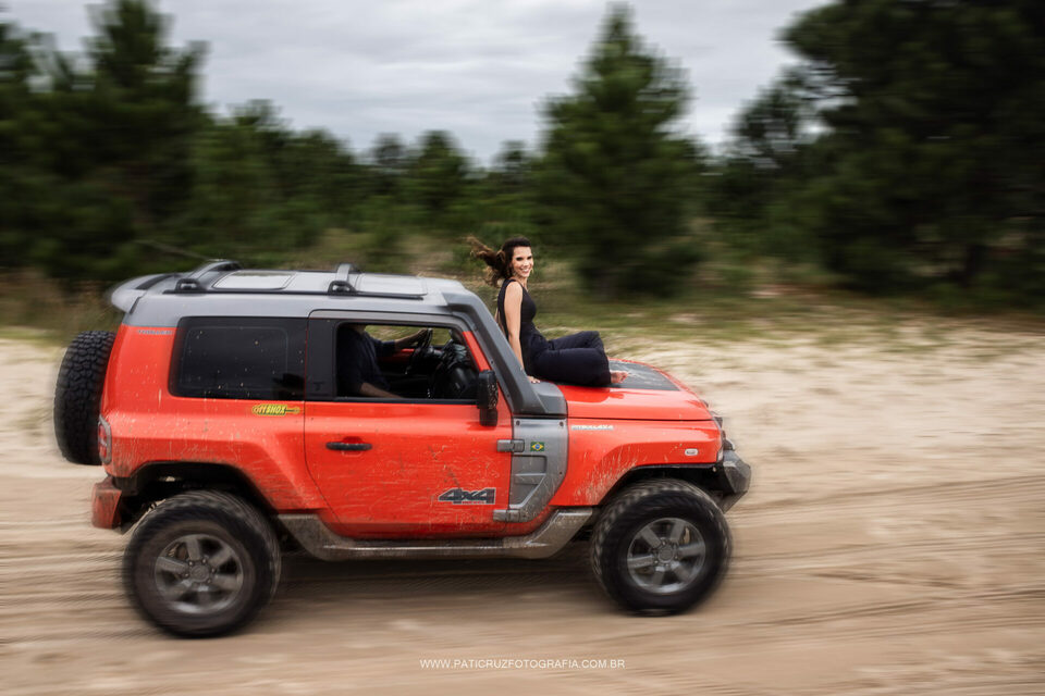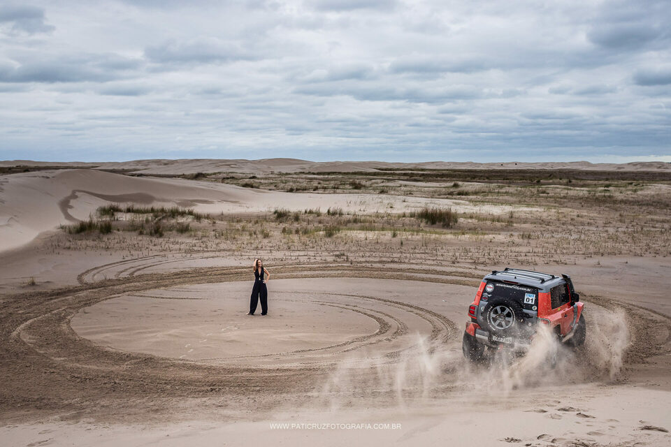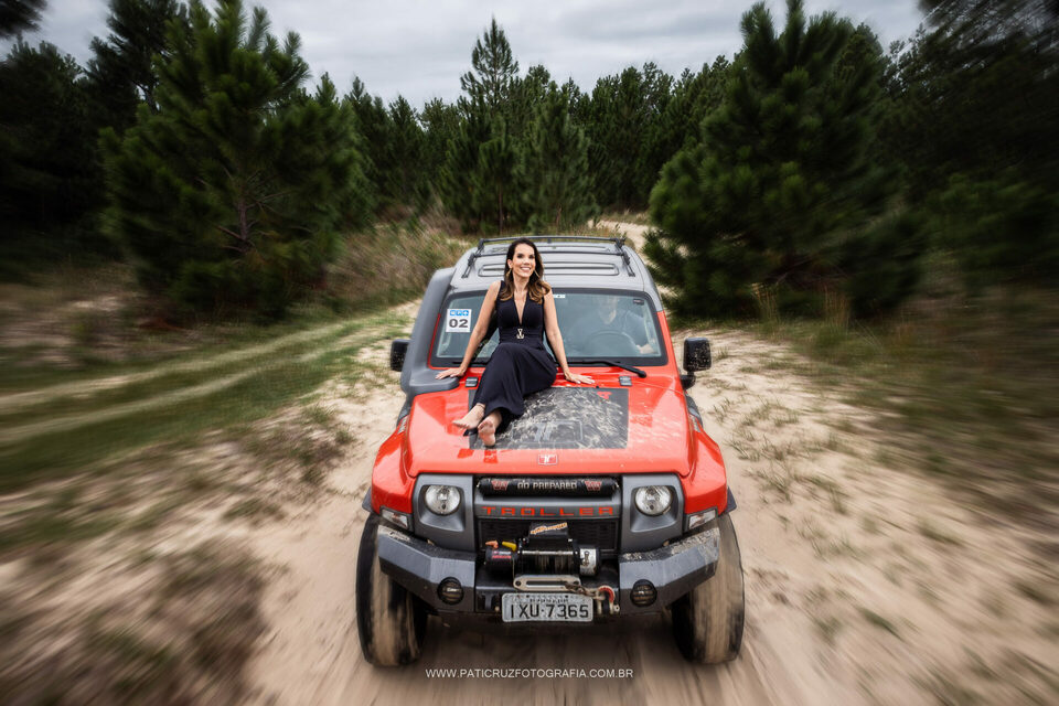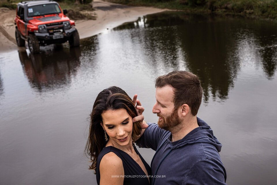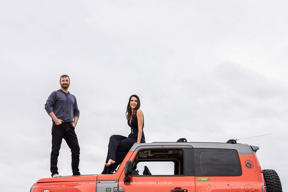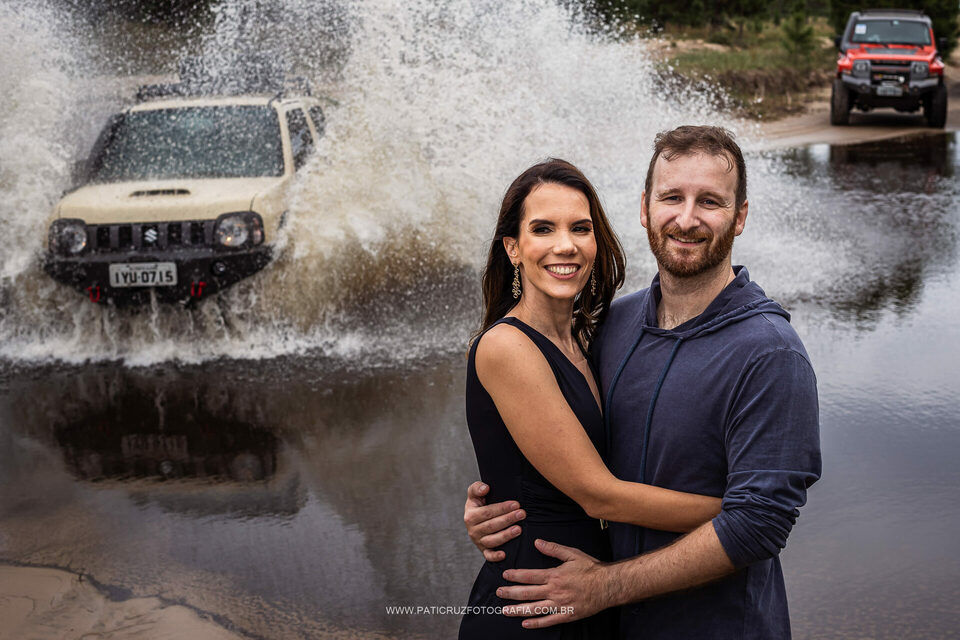 Para mim, registrar o ensaio deles foi uma experiência super legal, porque também sou uma pessoa aventureira, que adora uma trilha, um mato e uma barraca, e nunca tinha andado de troller em cima das dunas. Eles toparam todas as minhas ideias, e até em cima da troller eu e a Gabi andamos para conseguir fotos diferentes. E o Fabian, que não é muito chegado em posar para fotos, adorou realizar o ensaio fazendo o que ele ama: trilha com troller.