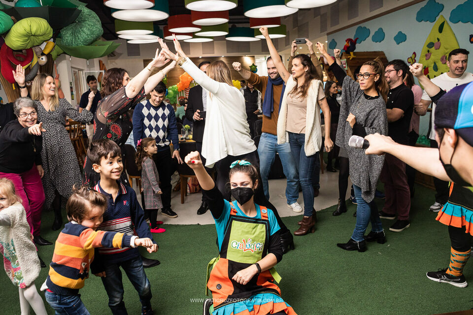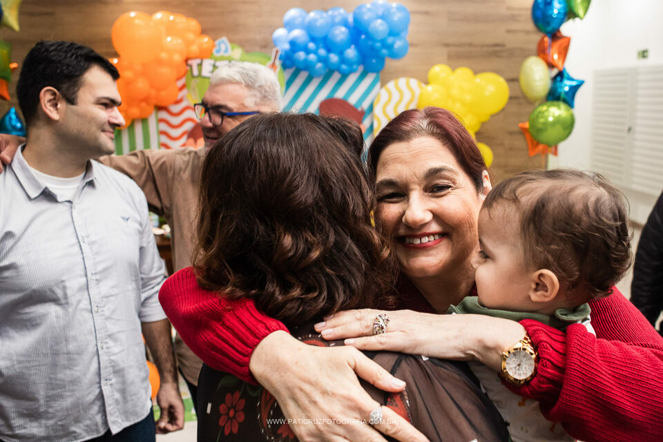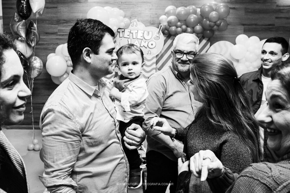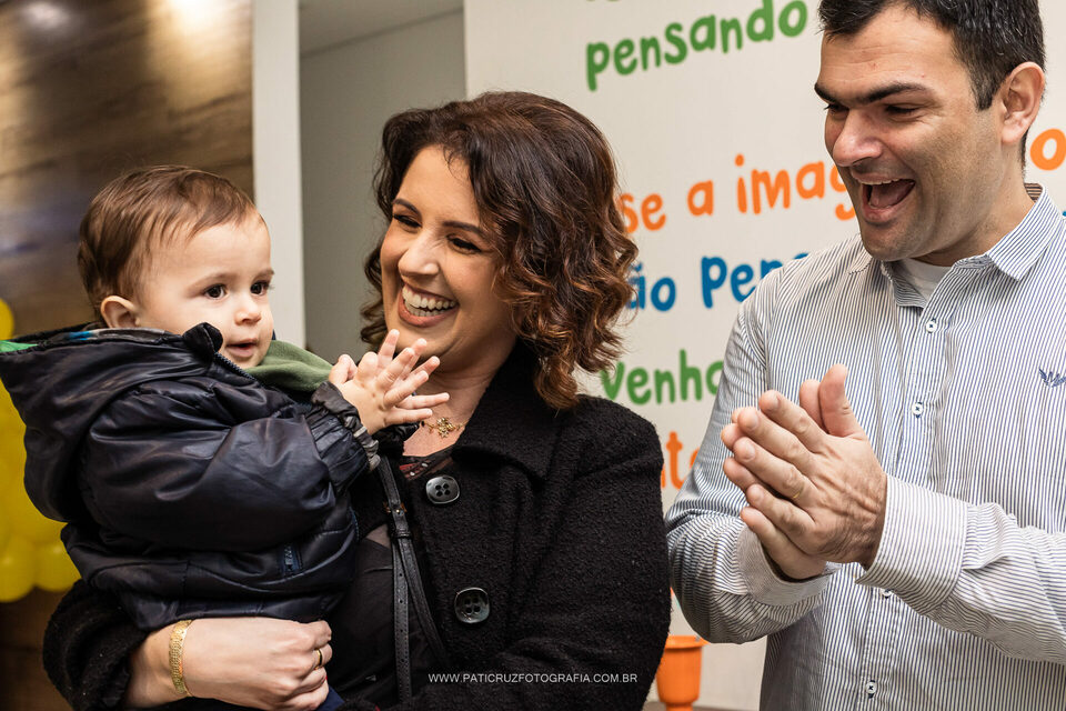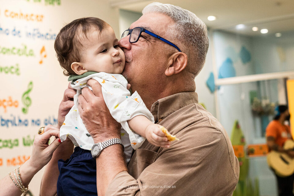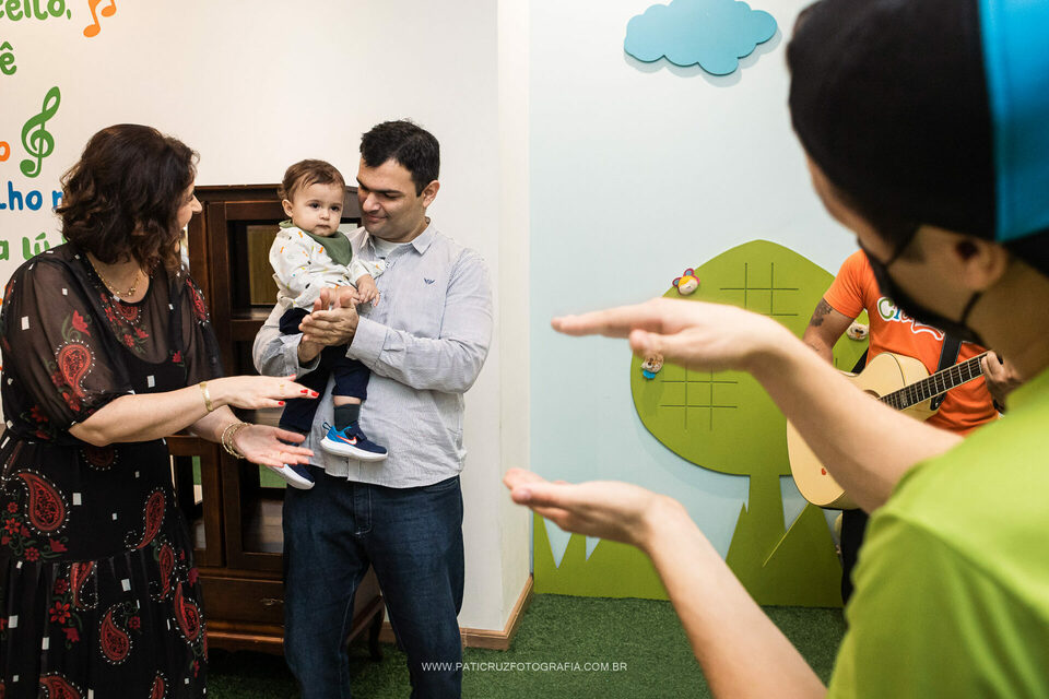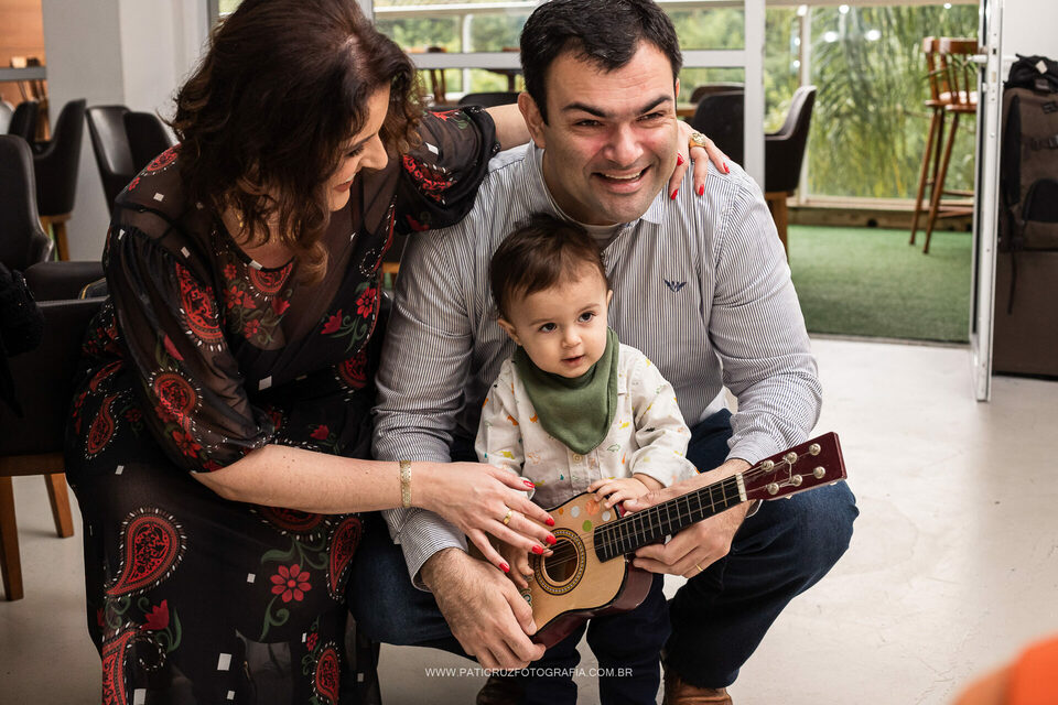 Os três foram recepcionados com cantoria bem animada, e logo de cara o Teteu já se agarrou no violão da decoração. Registrei a festa do início ao fim, captando muitas brincadeiras, abraços e afofadas no Teteu, que é um gurizinho super tranquilo.