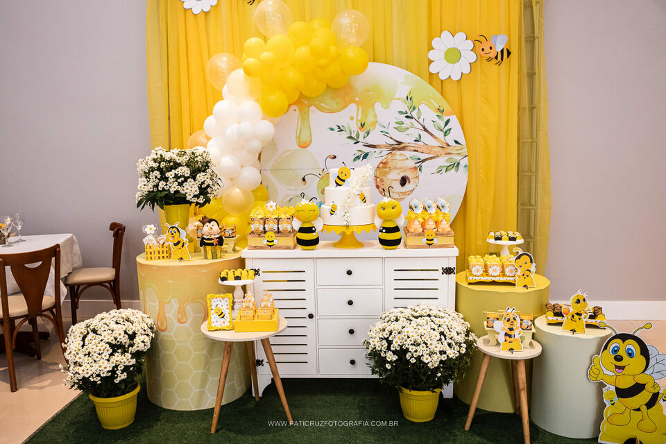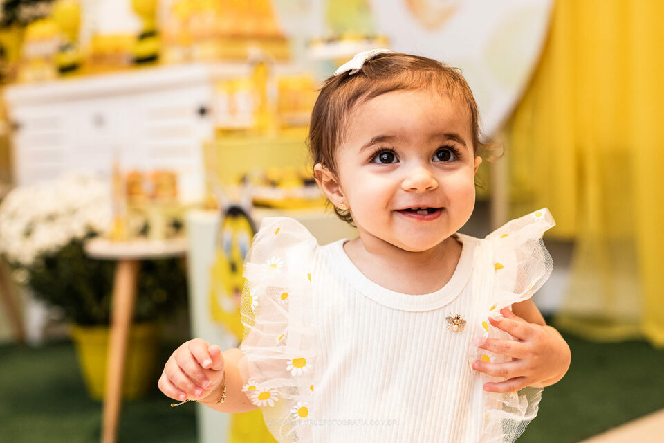 A festa de 1 ano da Anita foi comemorada em casa, no salão do condomínio. Cheguei cedo, para registrar a decoração, e me deparei com uma mesa lindamente decorada na temática de abelhas. A festa foi planejada nos mínimos detalhes. O vestido da Anita, o broche no peito, a unha da mamãe e até o rótulo das bebidas acompanhavam a temática da festa.