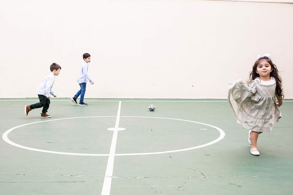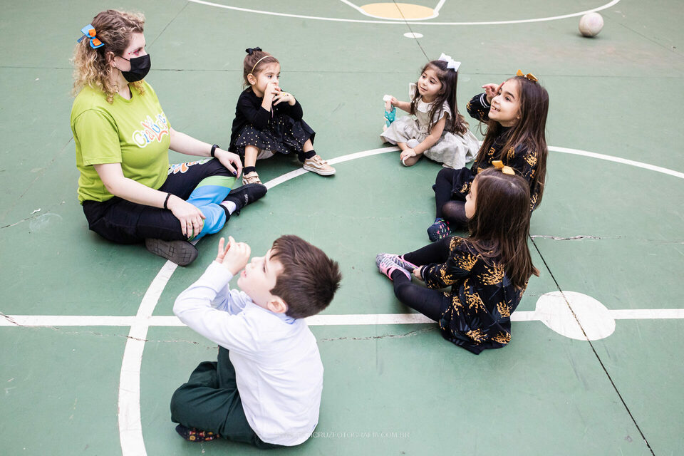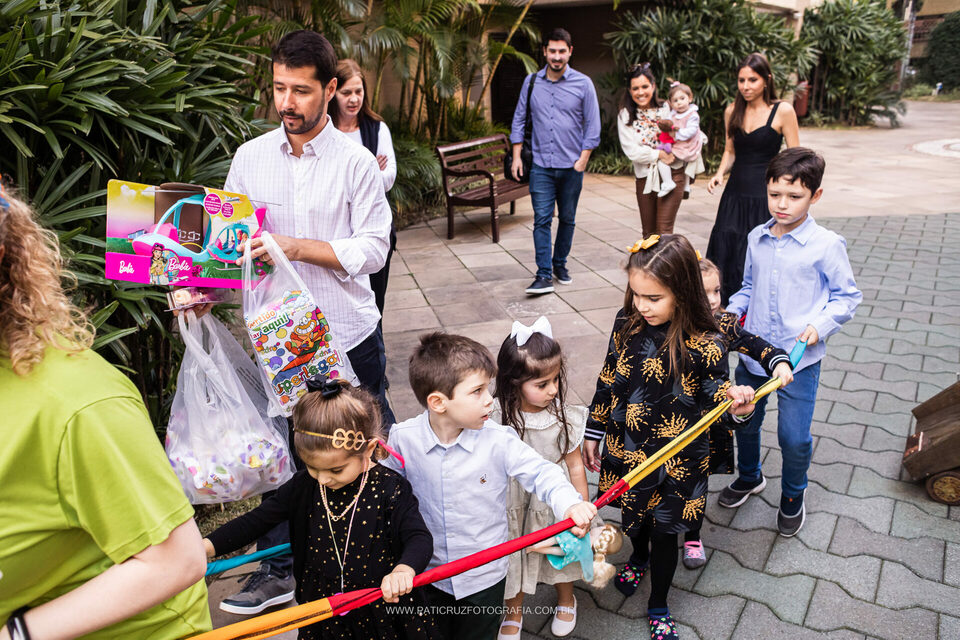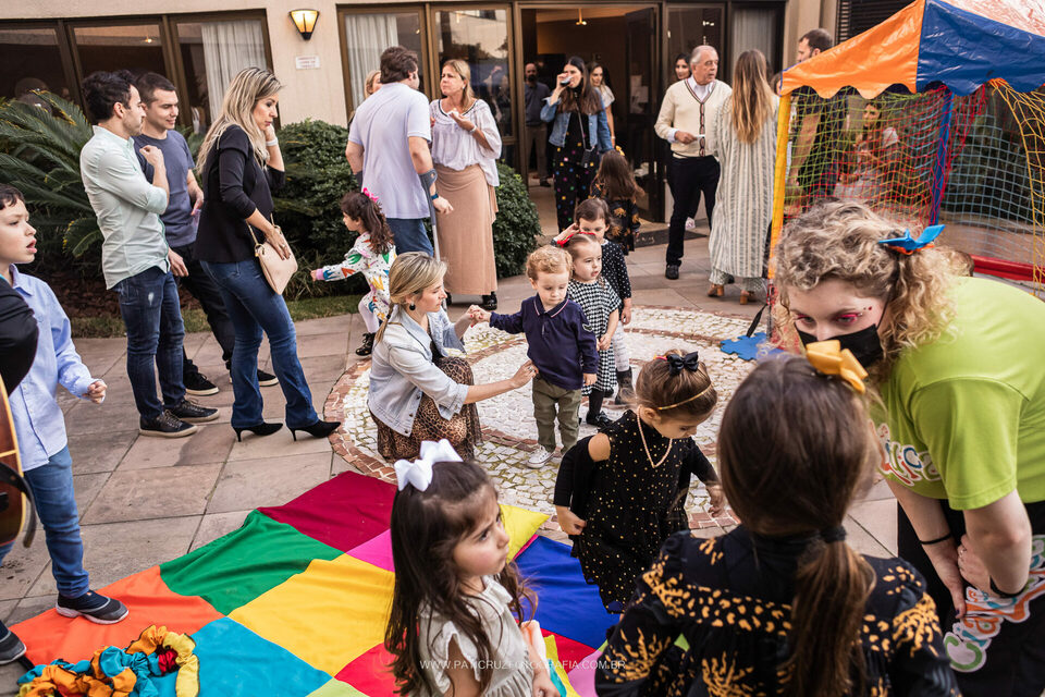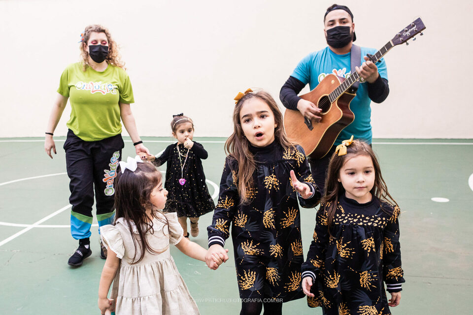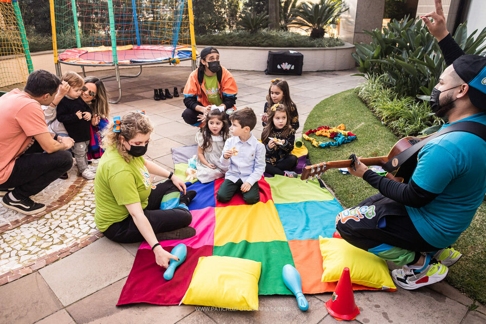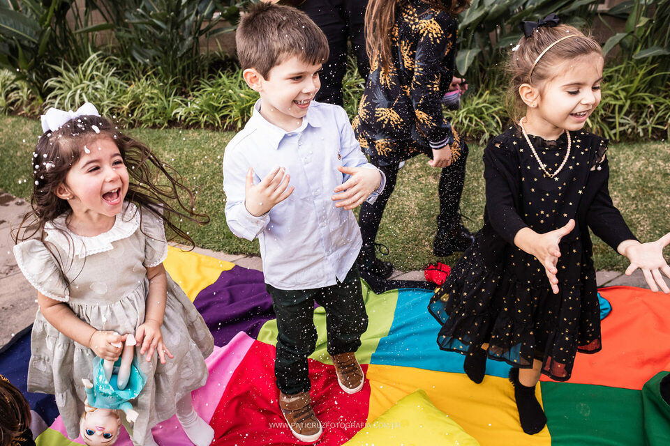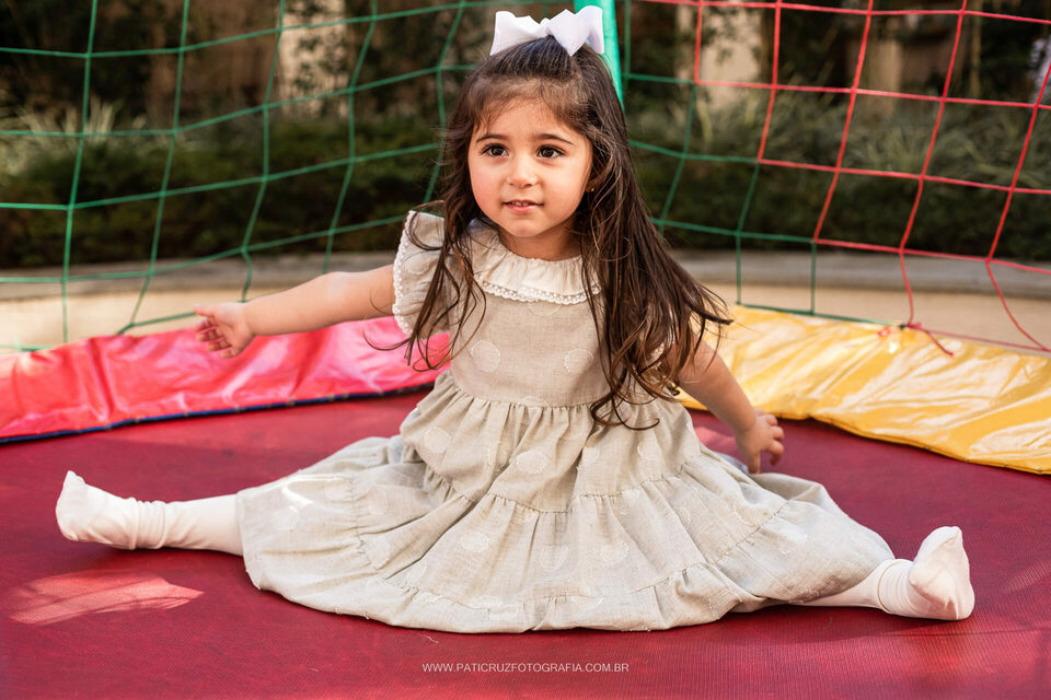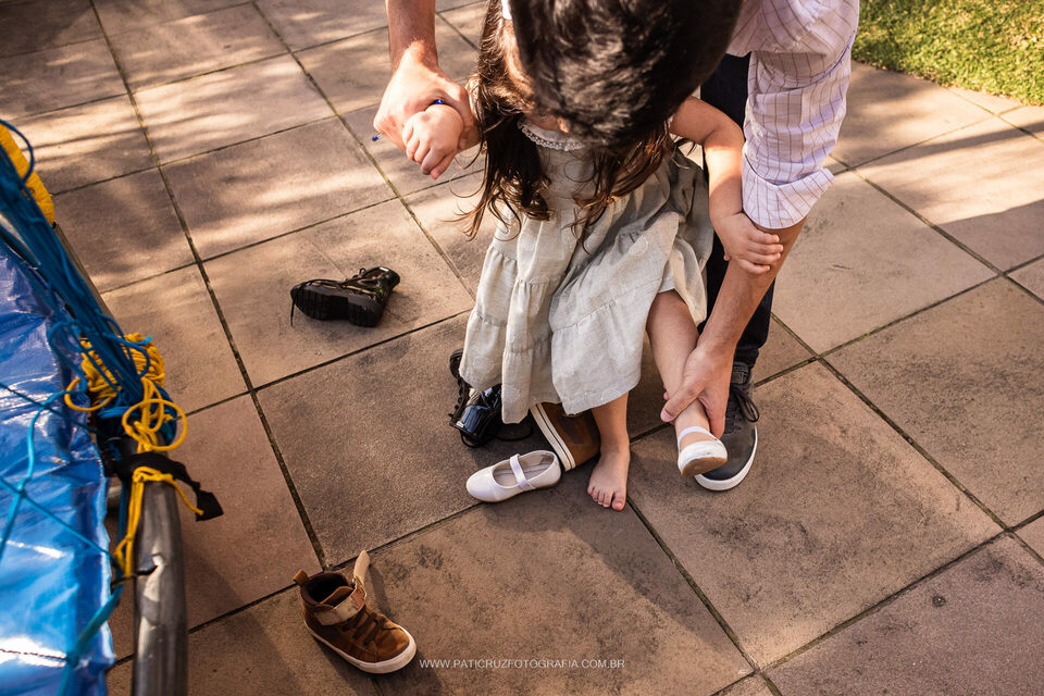 Apesar de ser julho e estarmos no auge do inverno, o dia estava quente quase como se fosse verão, por conta do sol gostoso que brilhava no céu azul sem nenhuma nuvem. Parecia que o dia havia sido encomendado para a festa da Catarina. Quando cheguei para fotografar, a aniversariante estava a mil na cama elástica e a avó já foi logo me avisando "vai ser difícil de tirar ela daqui". De fato a Tata ficou um bom tempo pulando no brinquedo, mas acabou se rendendo às brincadeiras da Cia Lúdica, na companhia dos primos e amigos, me possibilitando registrar muitas brincadeiras divertidas.