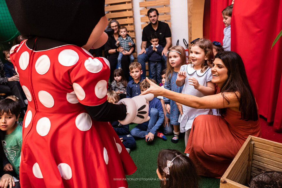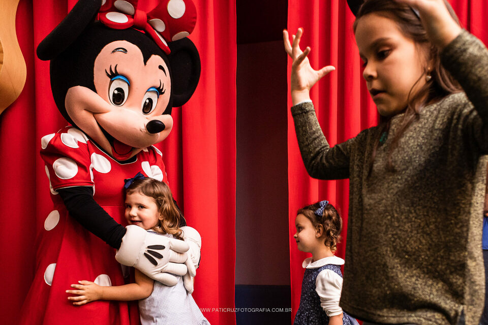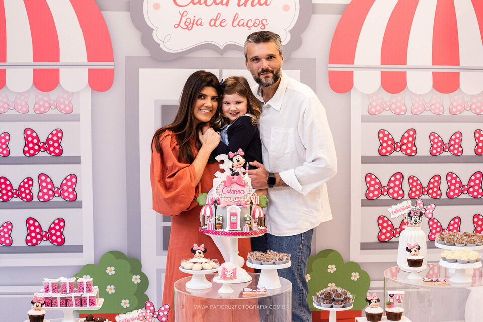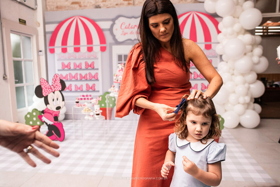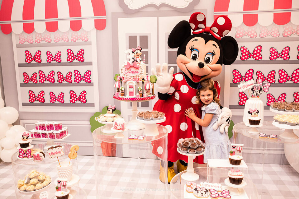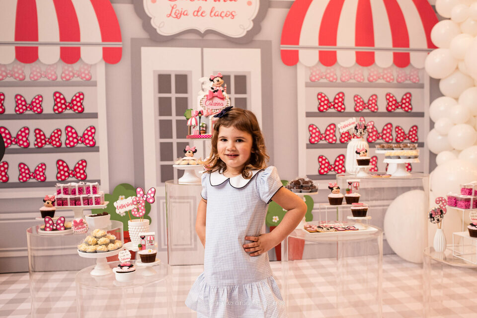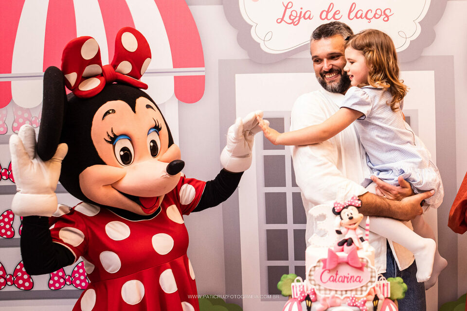 Ela ama a Minnie, então o tema da decoração não poderia ter sido outro se não a loja de laços da Minnie. Ou melhor, a loja de laços da Catarina. A recreação da festa ficou por conta da equipe da Cia da Criança, e a turma do Babinho levou a personagem querida Minnie para cantar parabéns e brincar com a Catarina.