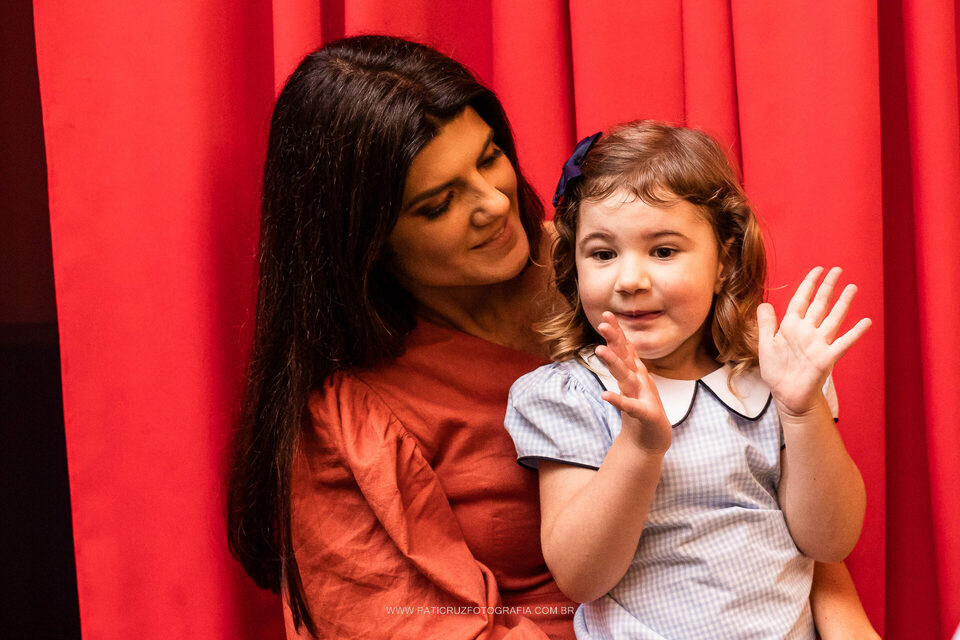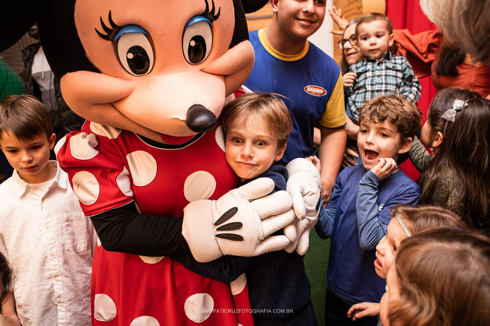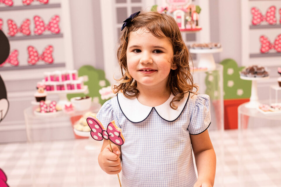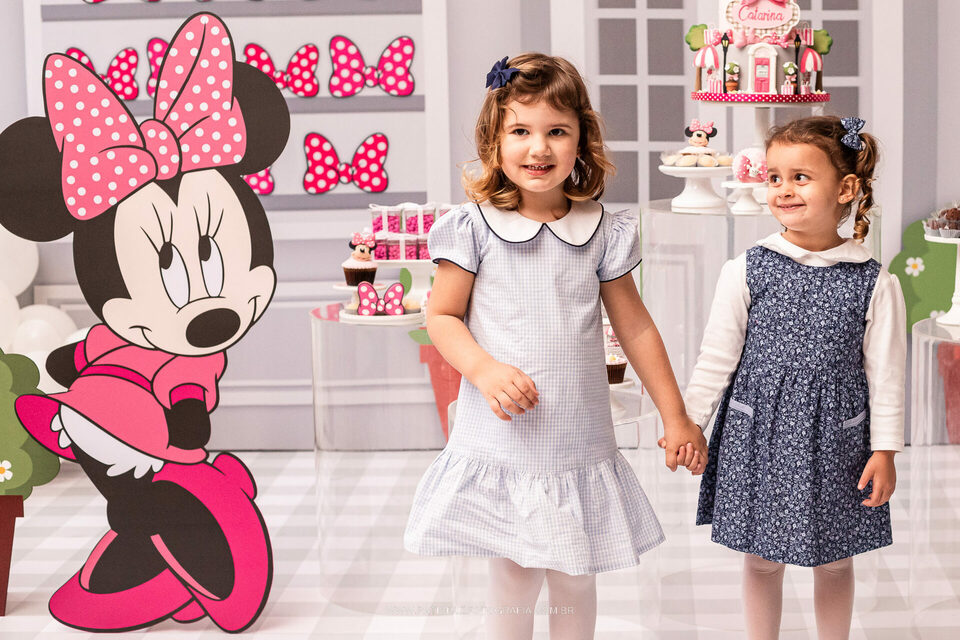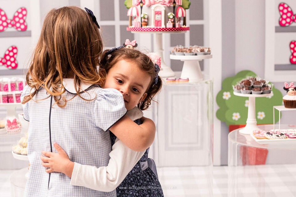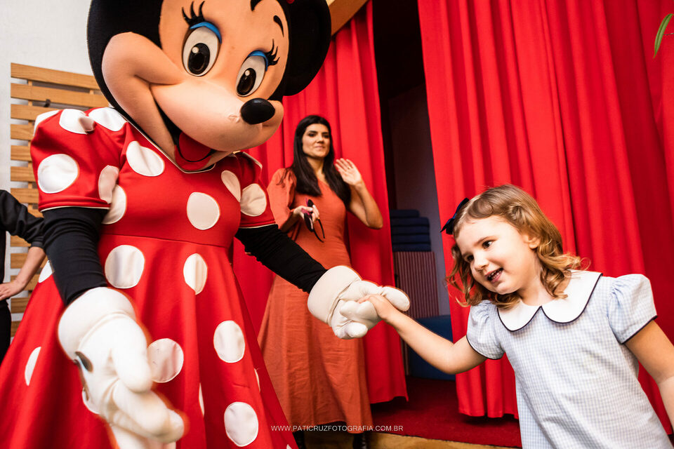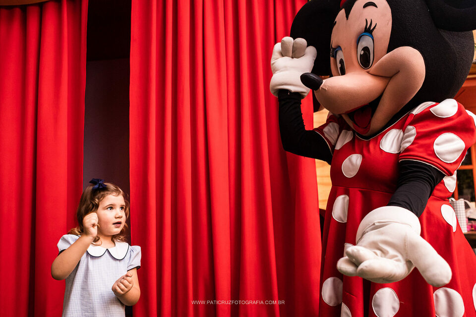 Ela ama a Minnie, então o tema da decoração não poderia ter sido outro se não a loja de laços da Minnie. Ou melhor, a loja de laços da Catarina. A recreação da festa ficou por conta da equipe da Cia da Criança, e a turma do Babinho levou a personagem querida Minnie para cantar parabéns e brincar com a Catarina.