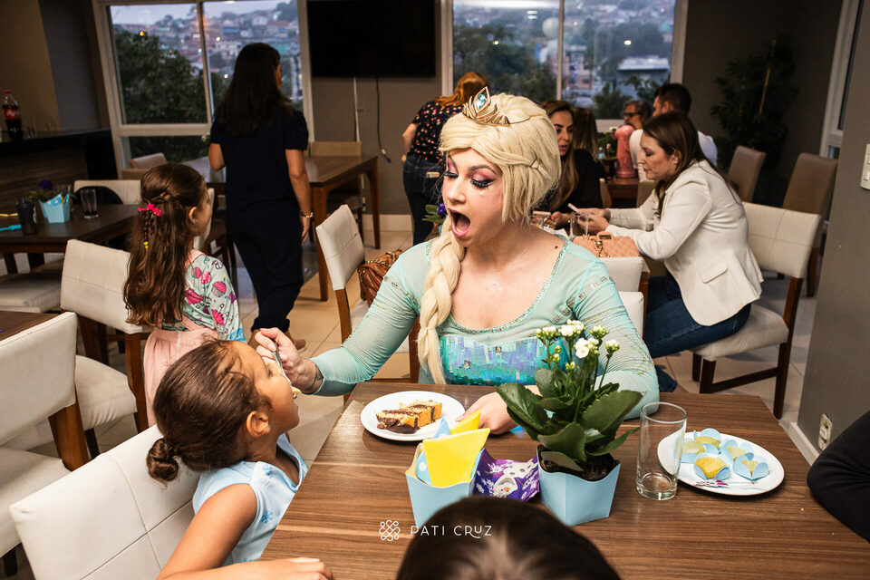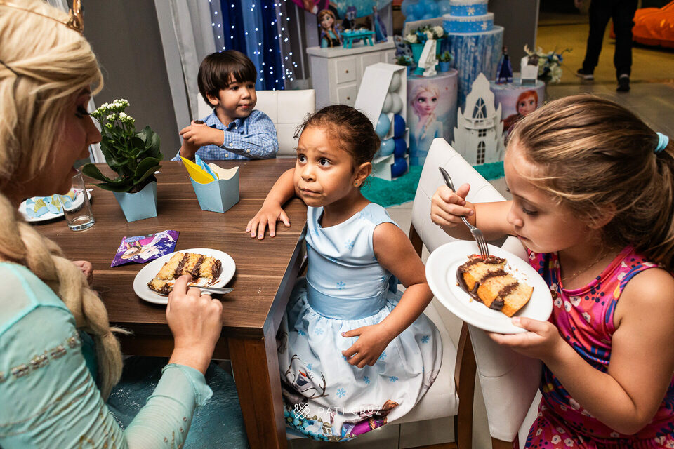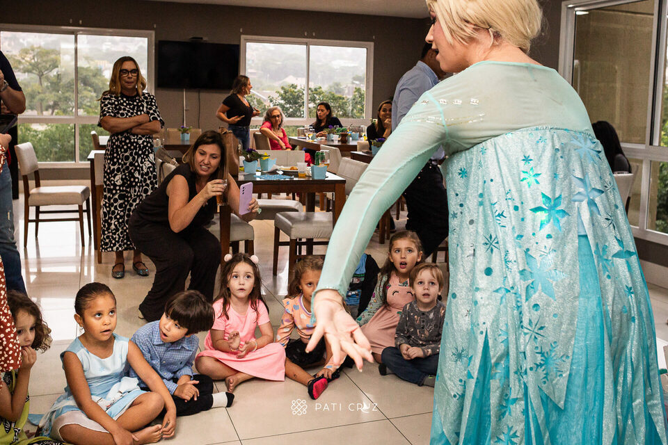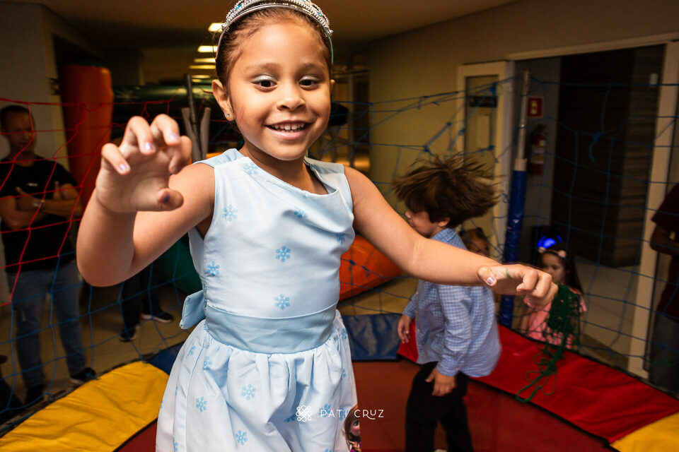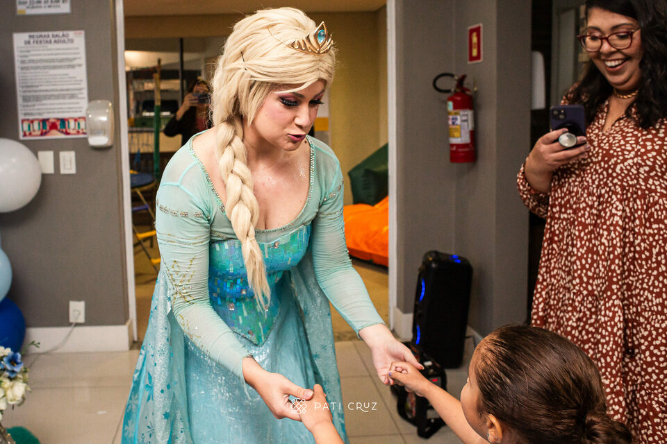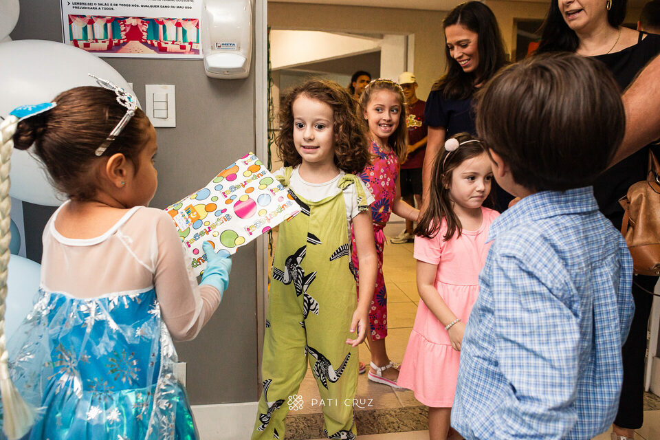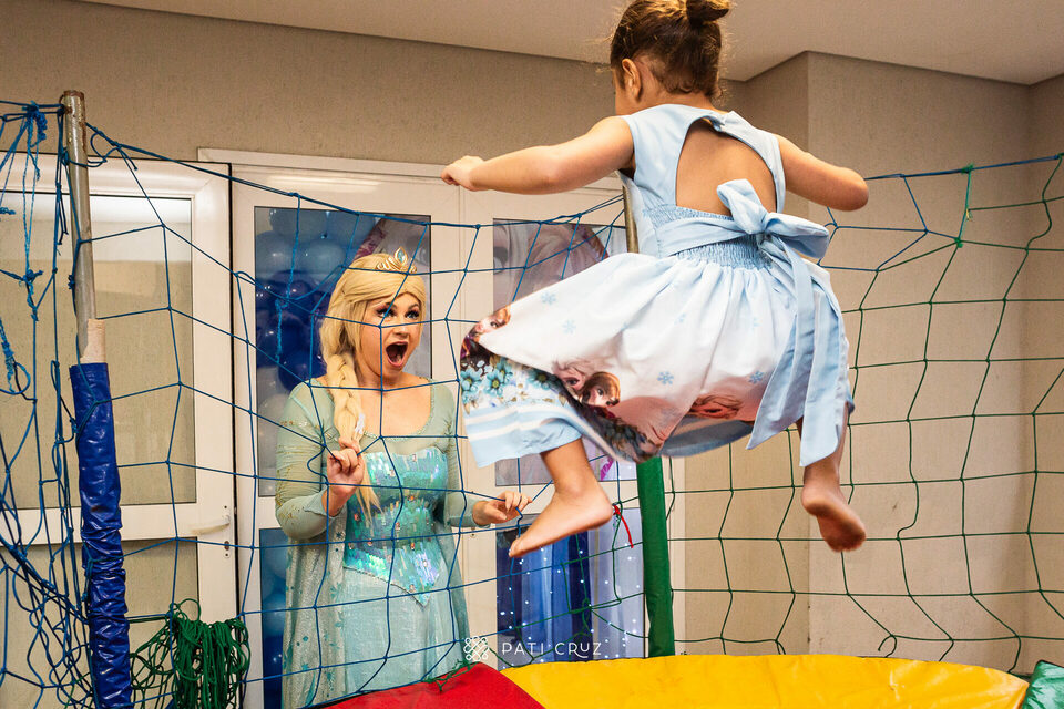 Os 4 anos da Ana Julia foram comemorados no salão do condomínio, com a temática clássica: Frozen. Já conheço a Ana Júlia há um tempo (inclusive aqui estão os registros da festa de 2 anos dela) e sei que ela é o tipo de menina mais tímida e centrada, mas que em pequenas coisas demonstra o que está sentindo e às vezes abre um sorrisão inesperado. No começo da festa ela estava bastante quietinha, mas aos poucos, conforme os amigos foram chegando, ela foi se soltando e aproveitou muito a cama elástica e o brinquedo inflável. Após algumas pipocas e uns goles de suco, chegou o momento da grande surpresa! A inesperada chegada da rainha Elsa deixou a pequena Ana Júlia anestesiada, não acreditando que estar vendo-a ao vivo em sua frente. A presença da personagem foi o ápice da festa e a Ana Julia não desgrudou dela por nem um segundo, aproveitando cada instante com a presença da princesa.