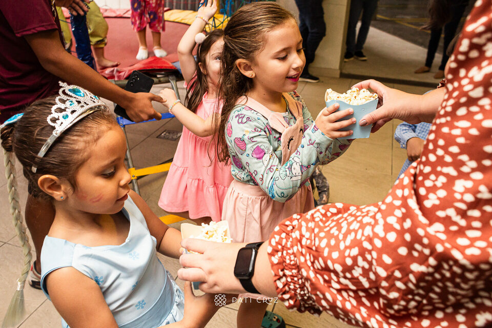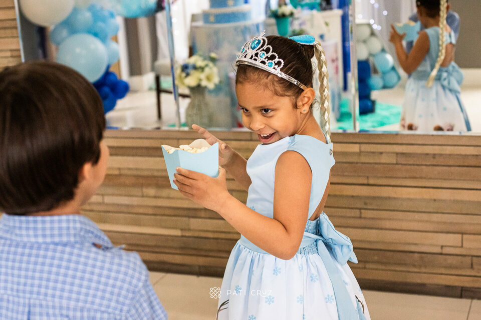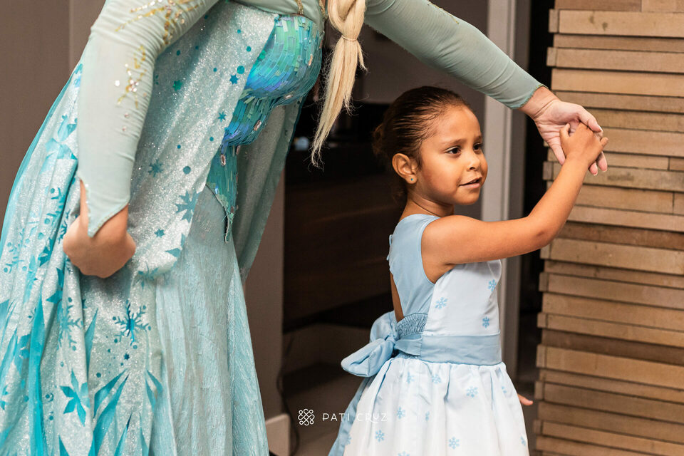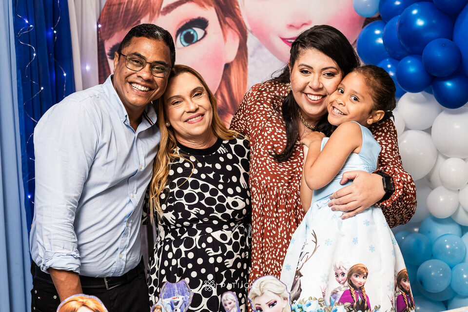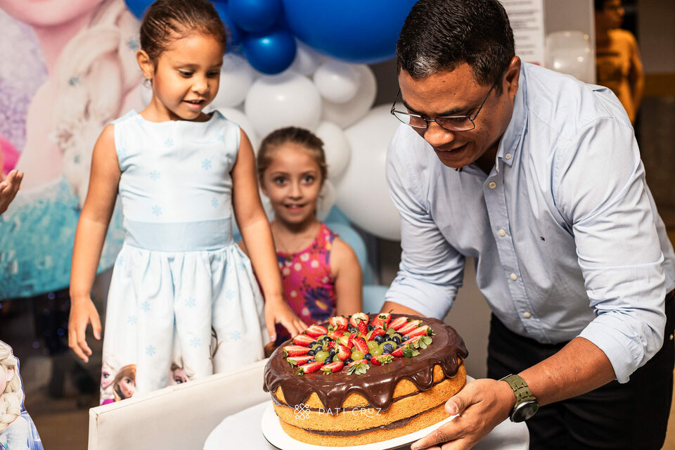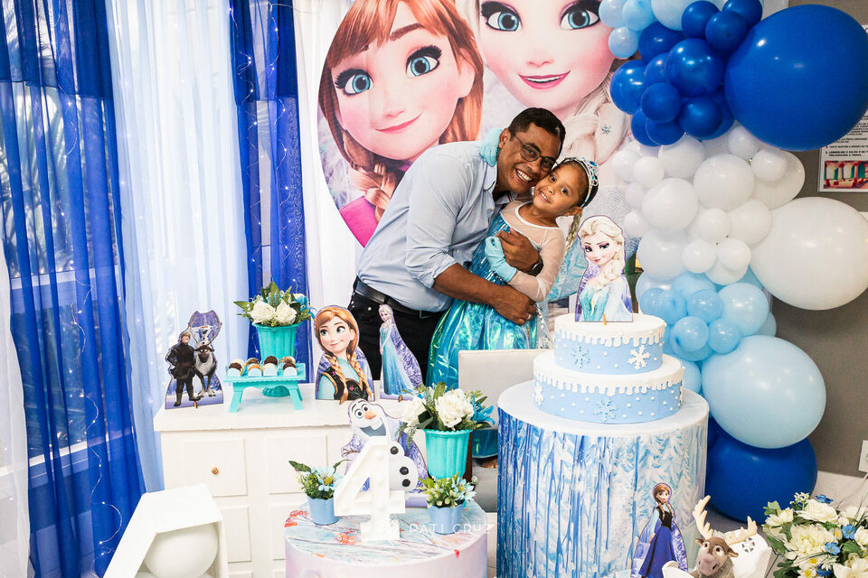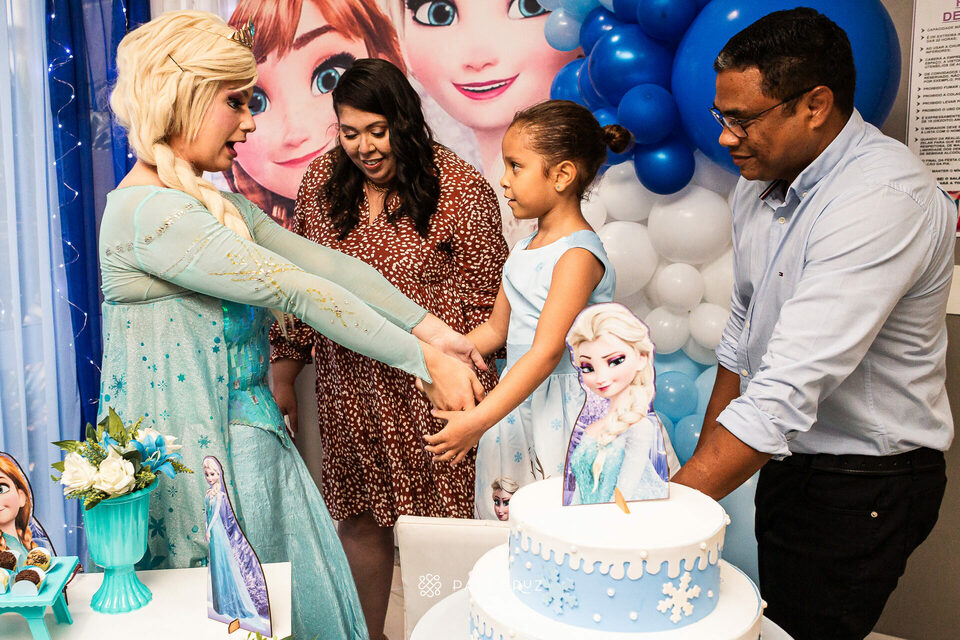 Os 4 anos da Ana Julia foram comemorados no salão do condomínio, com a temática clássica: Frozen. Já conheço a Ana Júlia há um tempo (inclusive aqui estão os registros da festa de 2 anos dela) e sei que ela é o tipo de menina mais tímida e centrada, mas que em pequenas coisas demonstra o que está sentindo e às vezes abre um sorrisão inesperado. No começo da festa ela estava bastante quietinha, mas aos poucos, conforme os amigos foram chegando, ela foi se soltando e aproveitou muito a cama elástica e o brinquedo inflável. Após algumas pipocas e uns goles de suco, chegou o momento da grande surpresa! A inesperada chegada da rainha Elsa deixou a pequena Ana Júlia anestesiada, não acreditando que estar vendo-a ao vivo em sua frente. A presença da personagem foi o ápice da festa e a Ana Julia não desgrudou dela por nem um segundo, aproveitando cada instante com a presença da princesa.