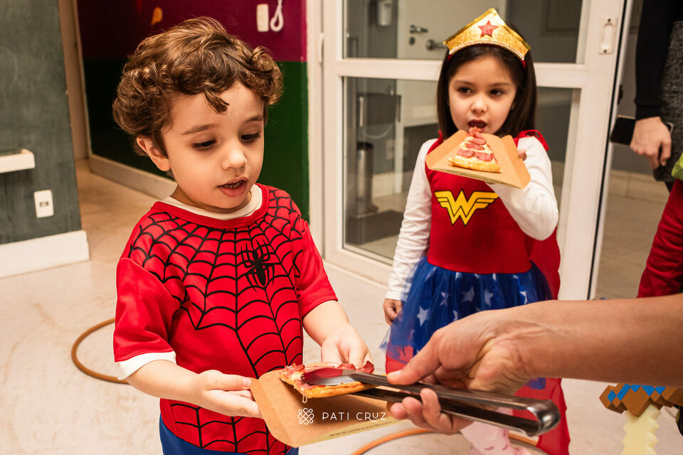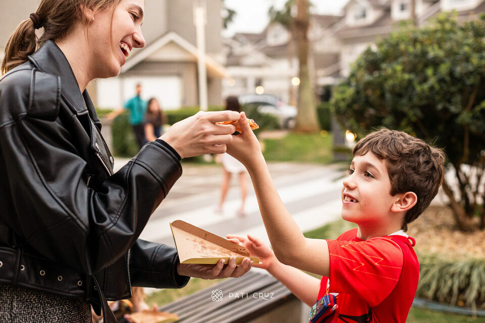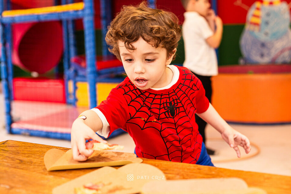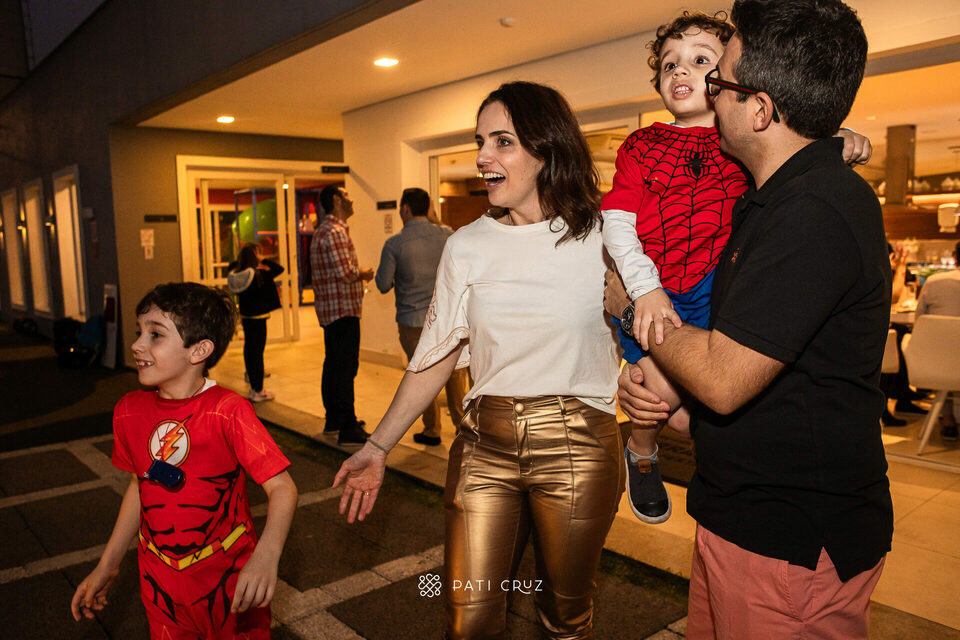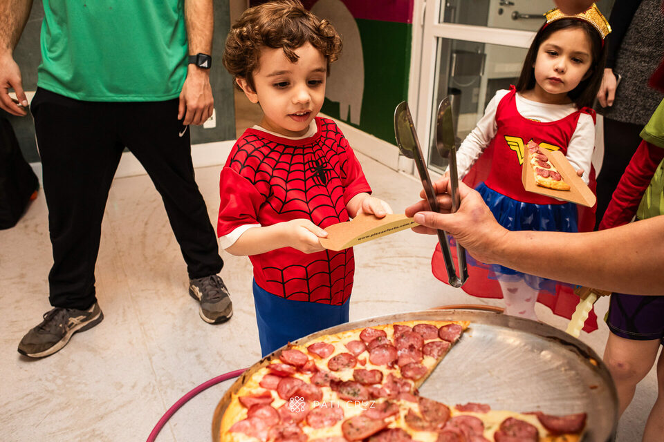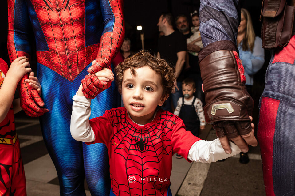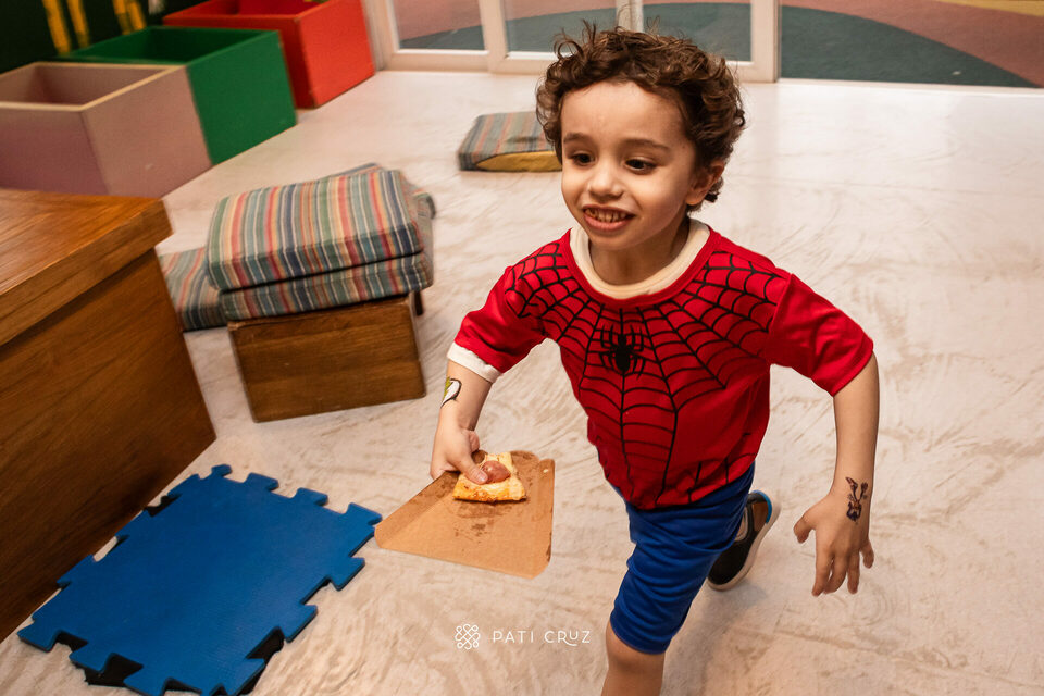 Aquele Caetano bebê que ainda engatinhava quando o conheci lá em 2021 deu lugar a um menino alegre e cheio de energia. Um Caetano que recebe seus convidados sorrindo e com abraços. Uma criança que, apesar da pouca idade, já aprendeu a aproveitar cada instante dos bons momentos da vida, e ao receber seus presentes, entrega instanteamente à sua mãe (ou ao adulto mais próximo, na ausência dela) e volta correndo para brincar, pois sabe que o momento de aproveitar a festa é agora, e os presentes poderão ser abertos depois. Um Caetano bom de garfo, que segurava um bambolê em uma mão e um pedaço de pizza na outra, para não perder nem a brincadeira, nem a comida. Um Caetano que adora pizza de calabresa, o único sabor que o vi comer dentre tantos que eram ofertados. Um Caetano fã do irmão mais velho, dos seus primos e dos heróis, e que ficou radiante com a chegada surpresa dos seus ídolos para a hora do parabéns.