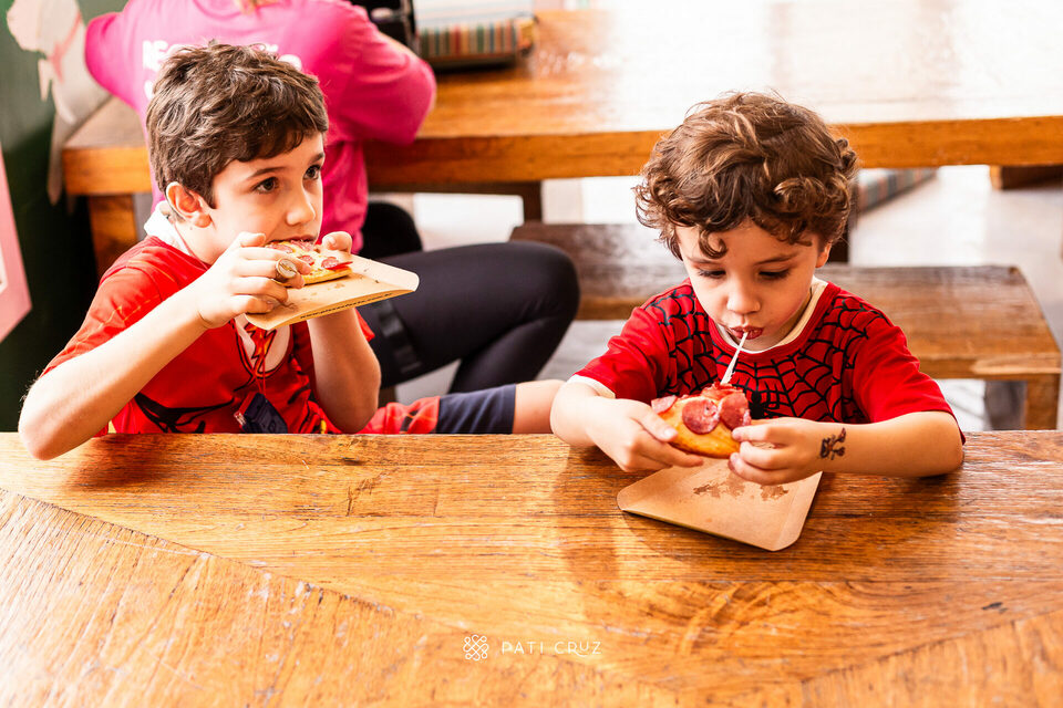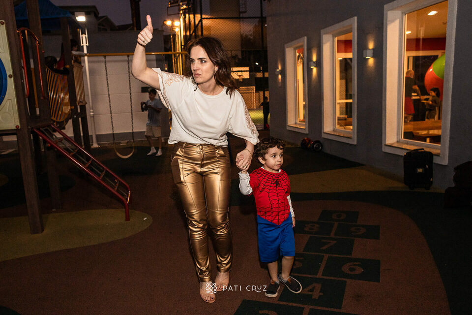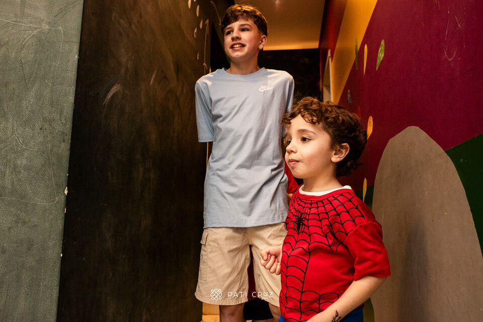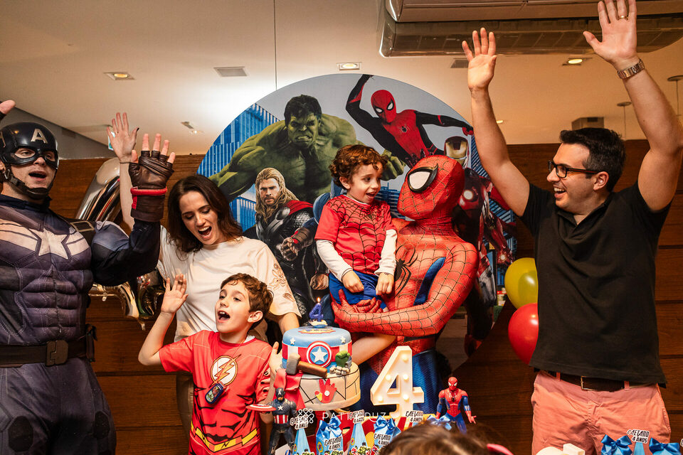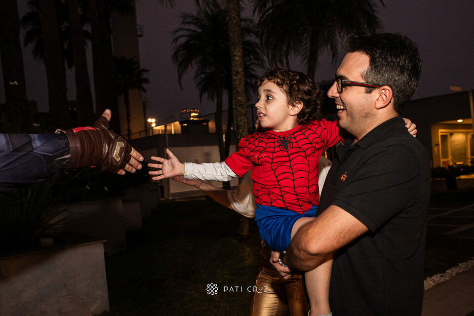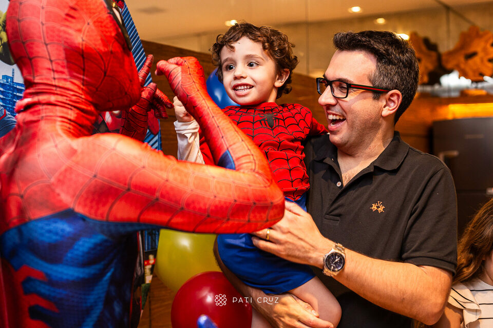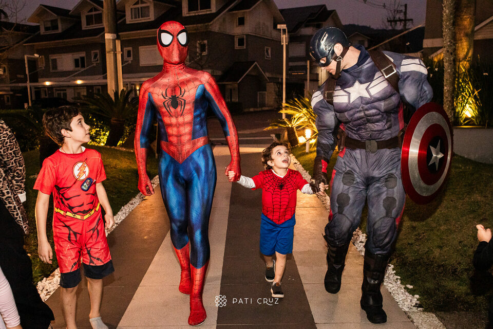 Aquele Caetano bebê que ainda engatinhava quando o conheci lá em 2021 deu lugar a um menino alegre e cheio de energia. Um Caetano que recebe seus convidados sorrindo e com abraços. Uma criança que, apesar da pouca idade, já aprendeu a aproveitar cada instante dos bons momentos da vida, e ao receber seus presentes, entrega instanteamente à sua mãe (ou ao adulto mais próximo, na ausência dela) e volta correndo para brincar, pois sabe que o momento de aproveitar a festa é agora, e os presentes poderão ser abertos depois. Um Caetano bom de garfo, que segurava um bambolê em uma mão e um pedaço de pizza na outra, para não perder nem a brincadeira, nem a comida. Um Caetano que adora pizza de calabresa, o único sabor que o vi comer dentre tantos que eram ofertados. Um Caetano fã do irmão mais velho, dos seus primos e dos heróis, e que ficou radiante com a chegada surpresa dos seus ídolos para a hora do parabéns.