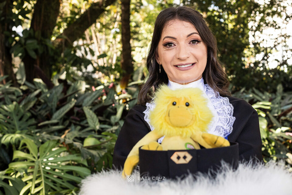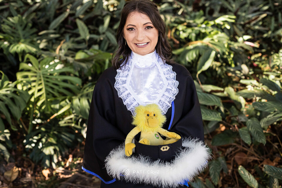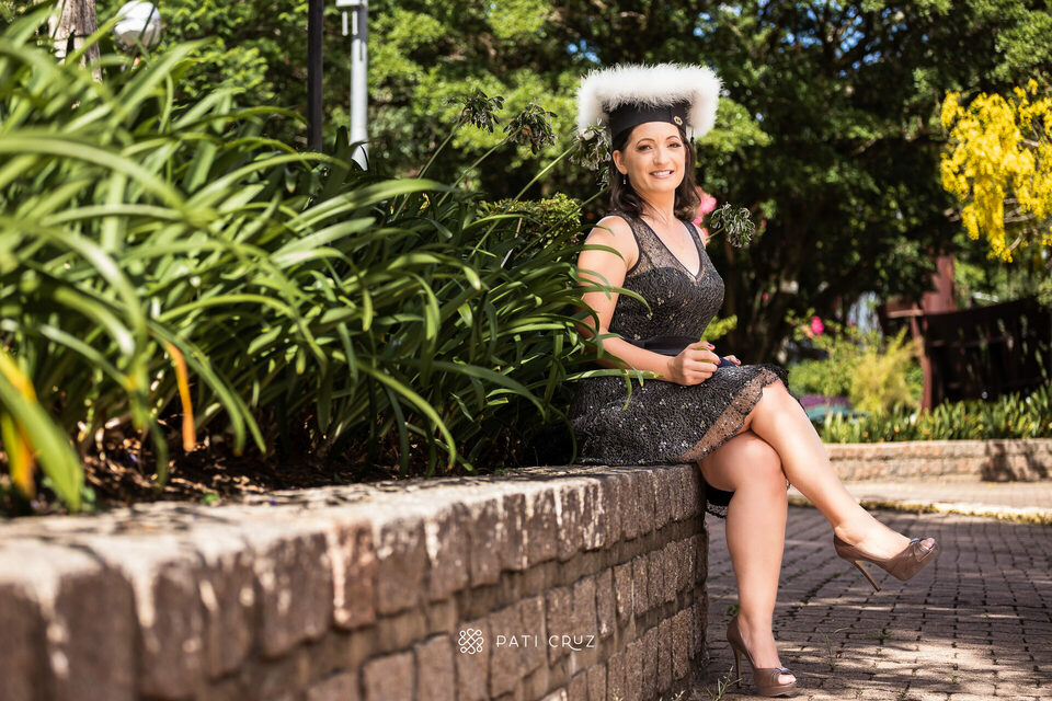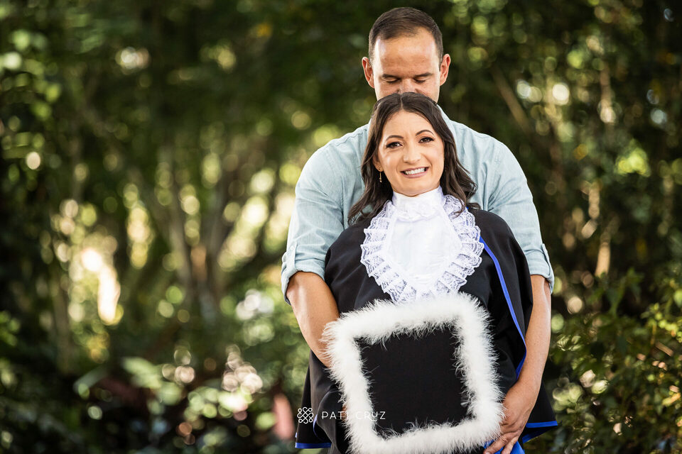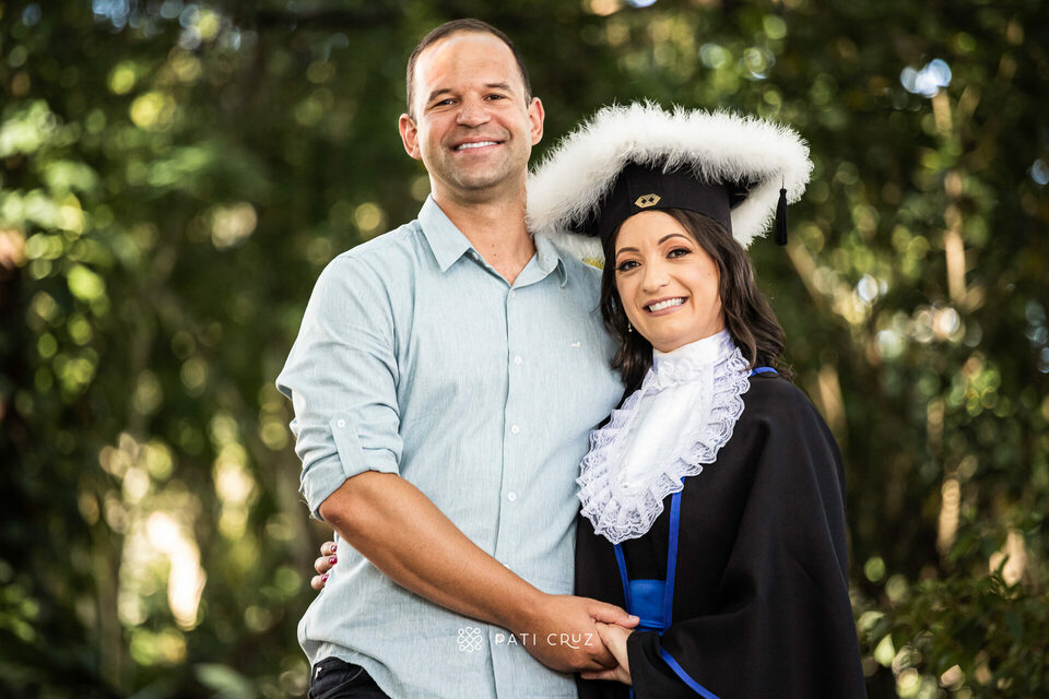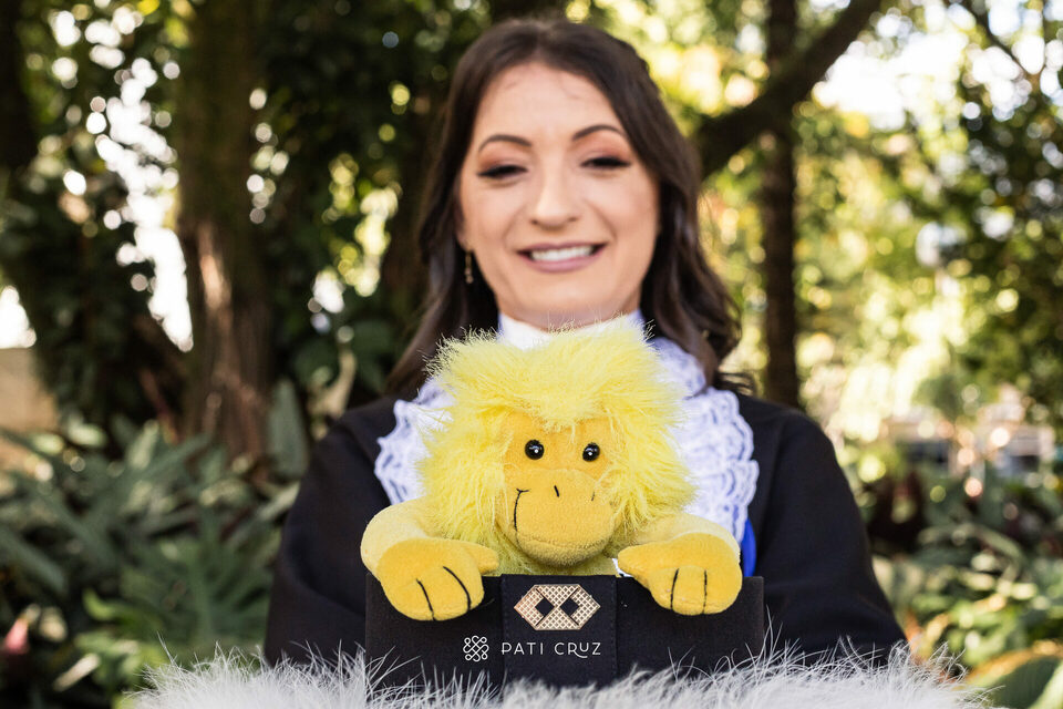 A Dianne se formou em gabinete, mas a cunhada dela não deixou o momento passar em branco e contratou um ensaio de formatura para presenteá-la. Fizemos o ensaio na PUCRS, com a participação da mãe da Di, do esposo e da enteada. O pai, que partiu pouco tempo antes, foi representado pelo macaquinho amarelo, presente de infância dado à filha. No momento desses registros, a formanda não conseguiu conter as lágrimas de saudade, mas também de orgulho pela grande conquista.