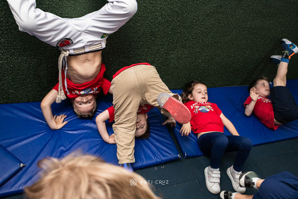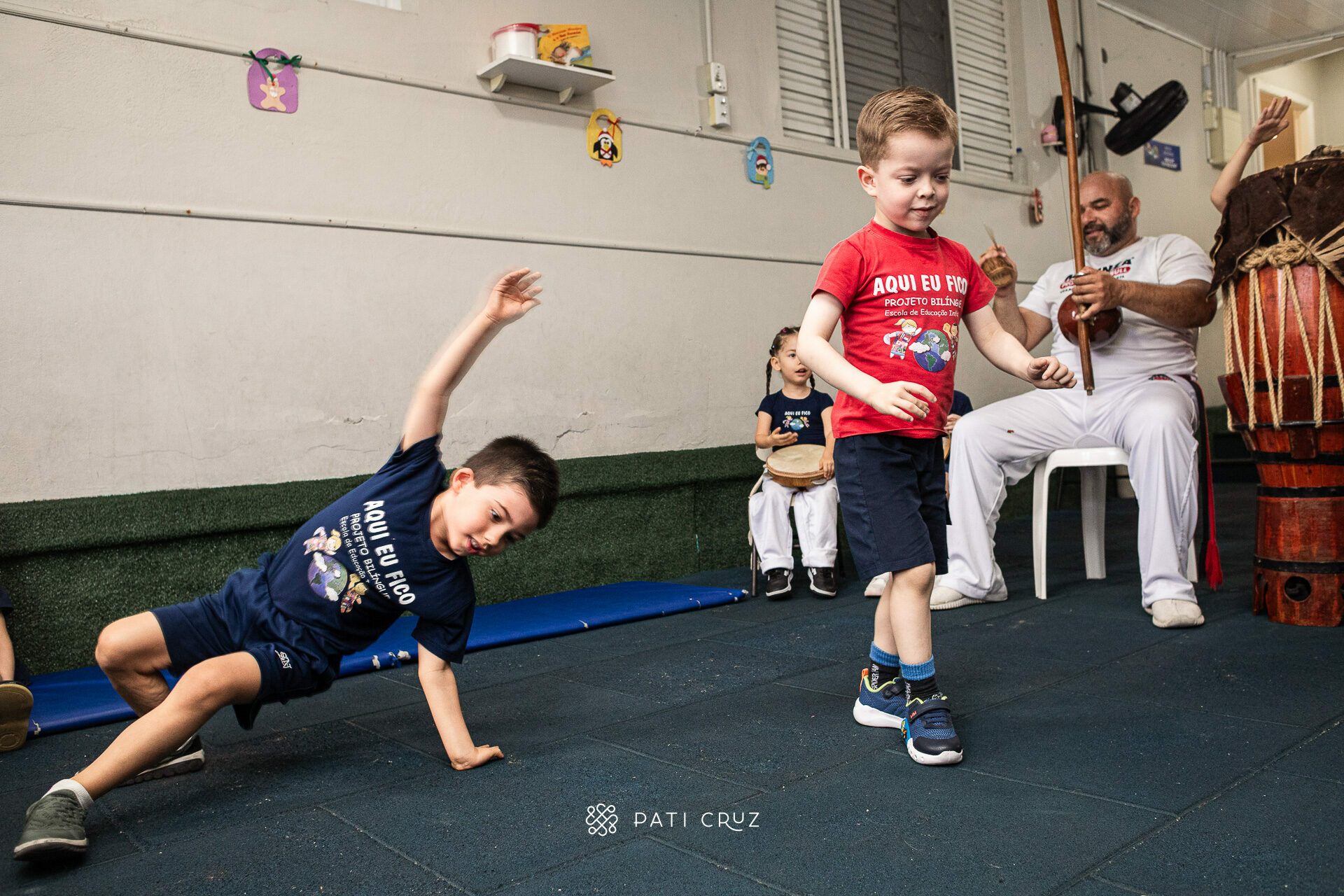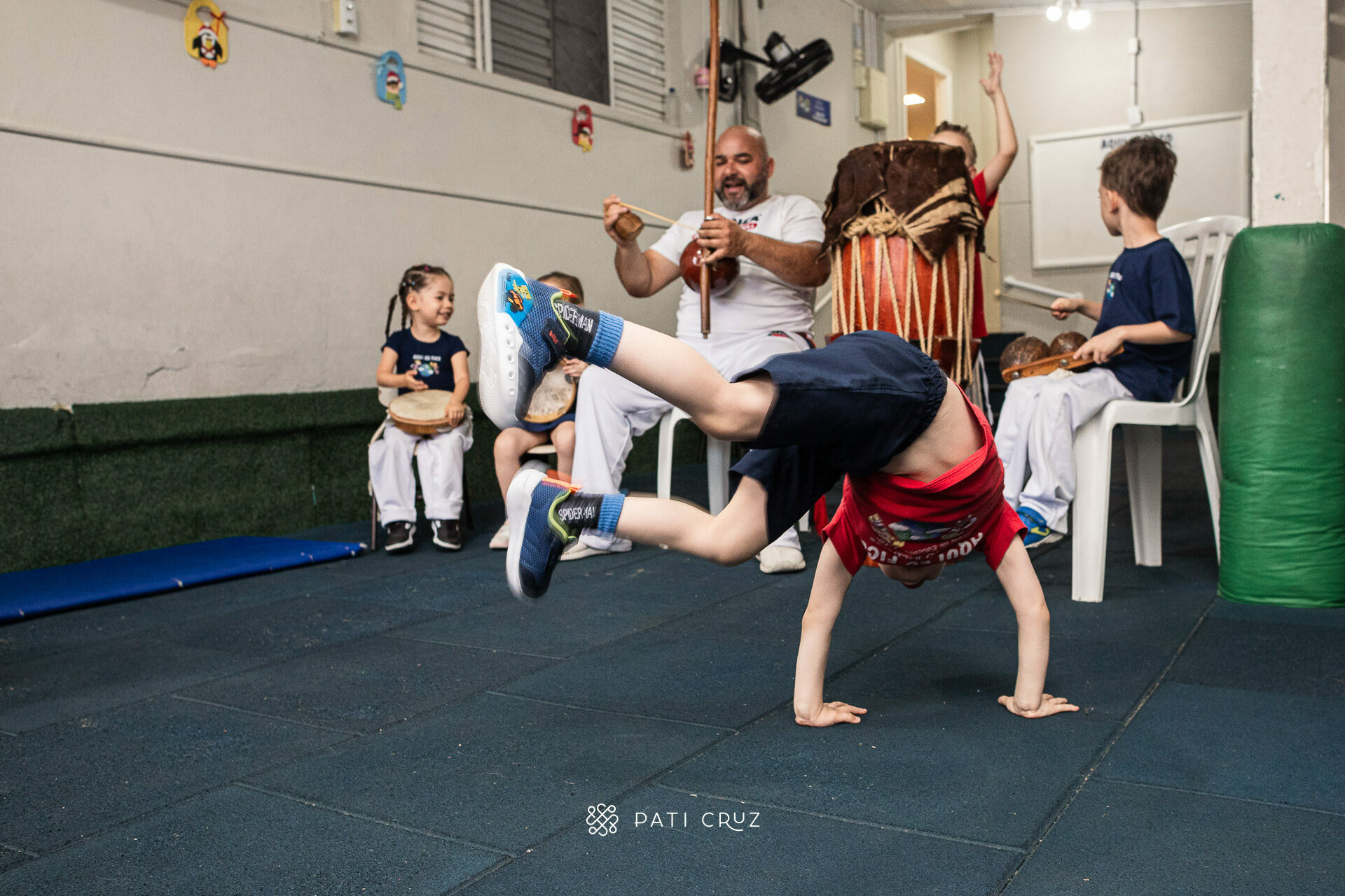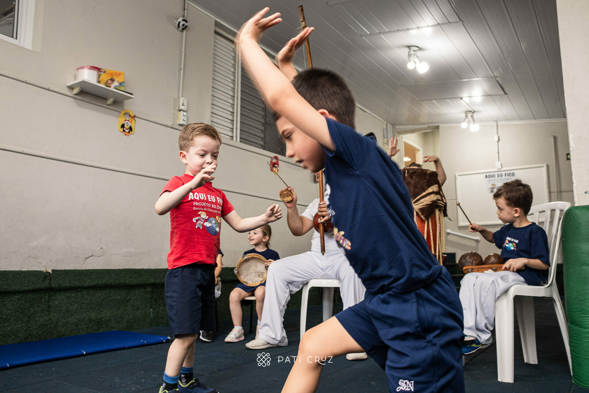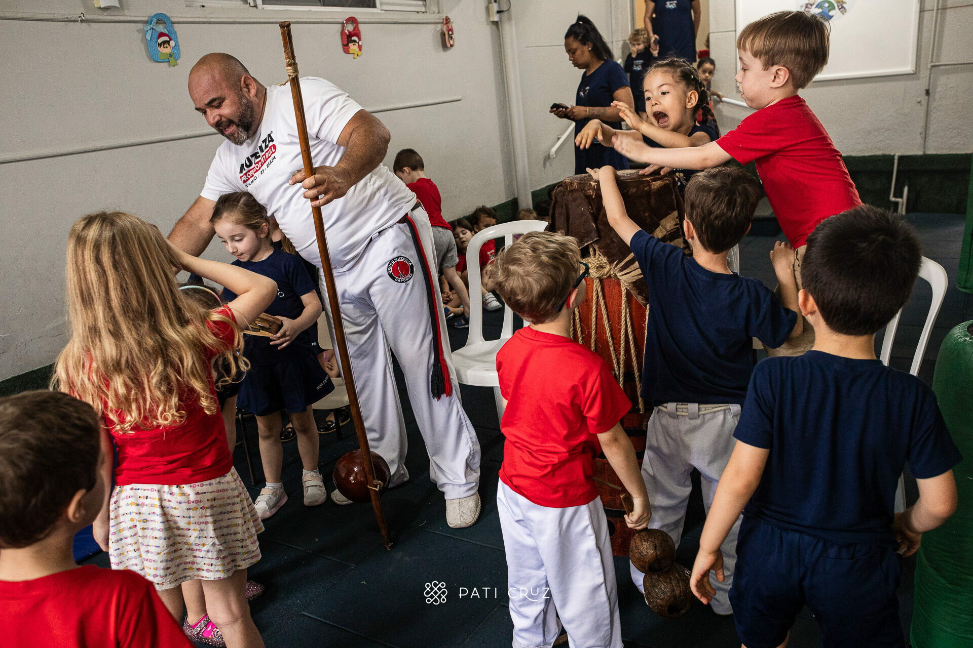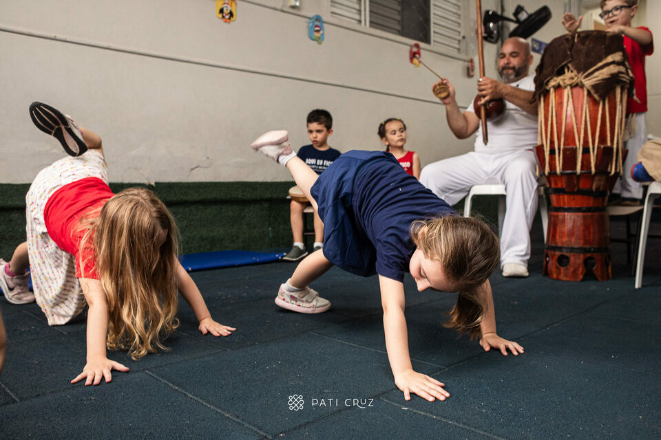 Logo depois, o som do berimbau tomou o espaço. Na aula de capoeira, corpos pequenos aprenderam a gingar, a se equilibrar, a ouvir o ritmo. Foi um momento de tradição e o movimento criaram uma roda de cultura e brincadeira.