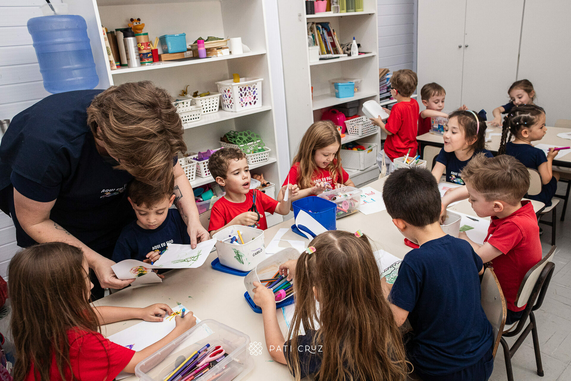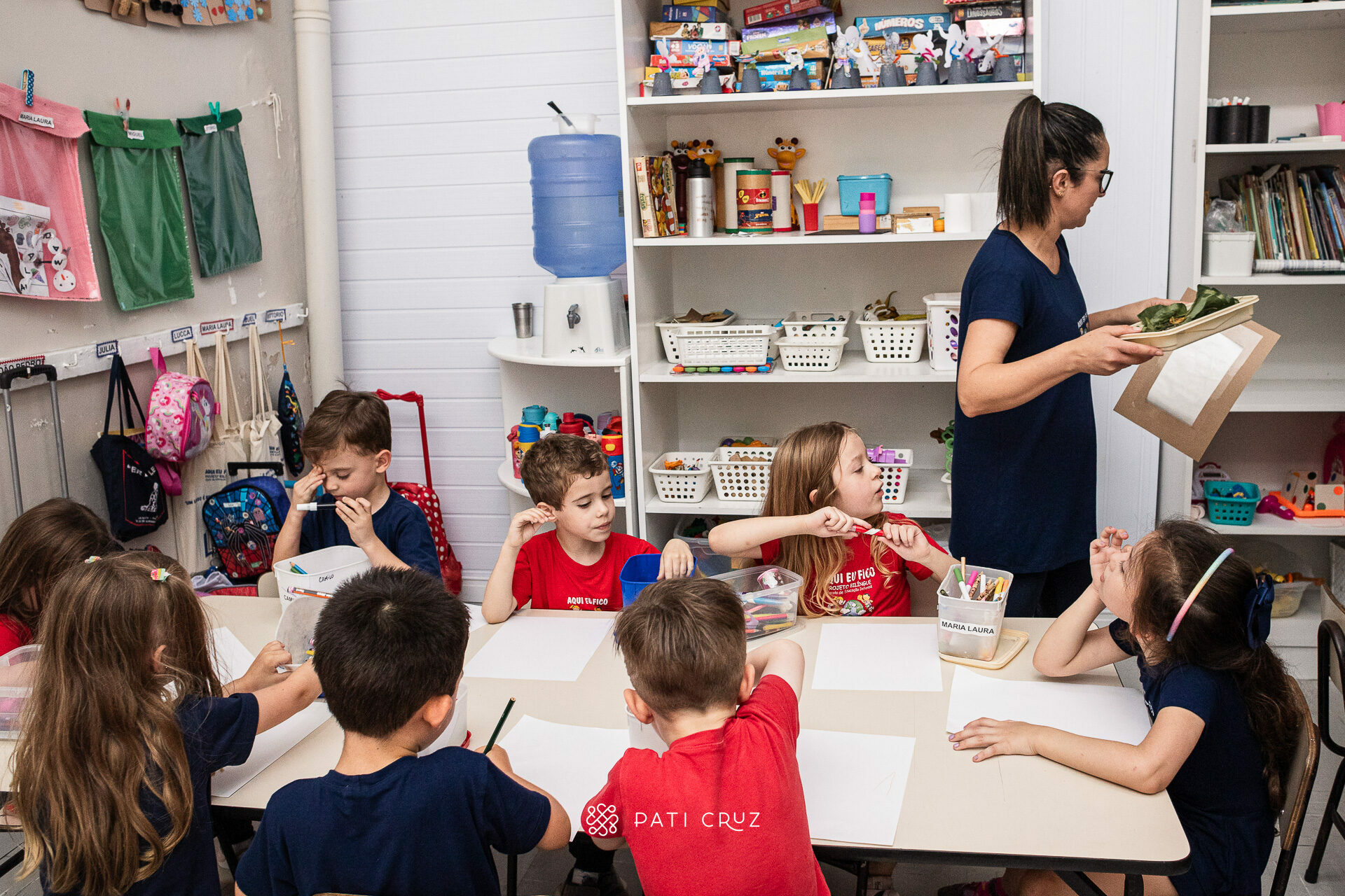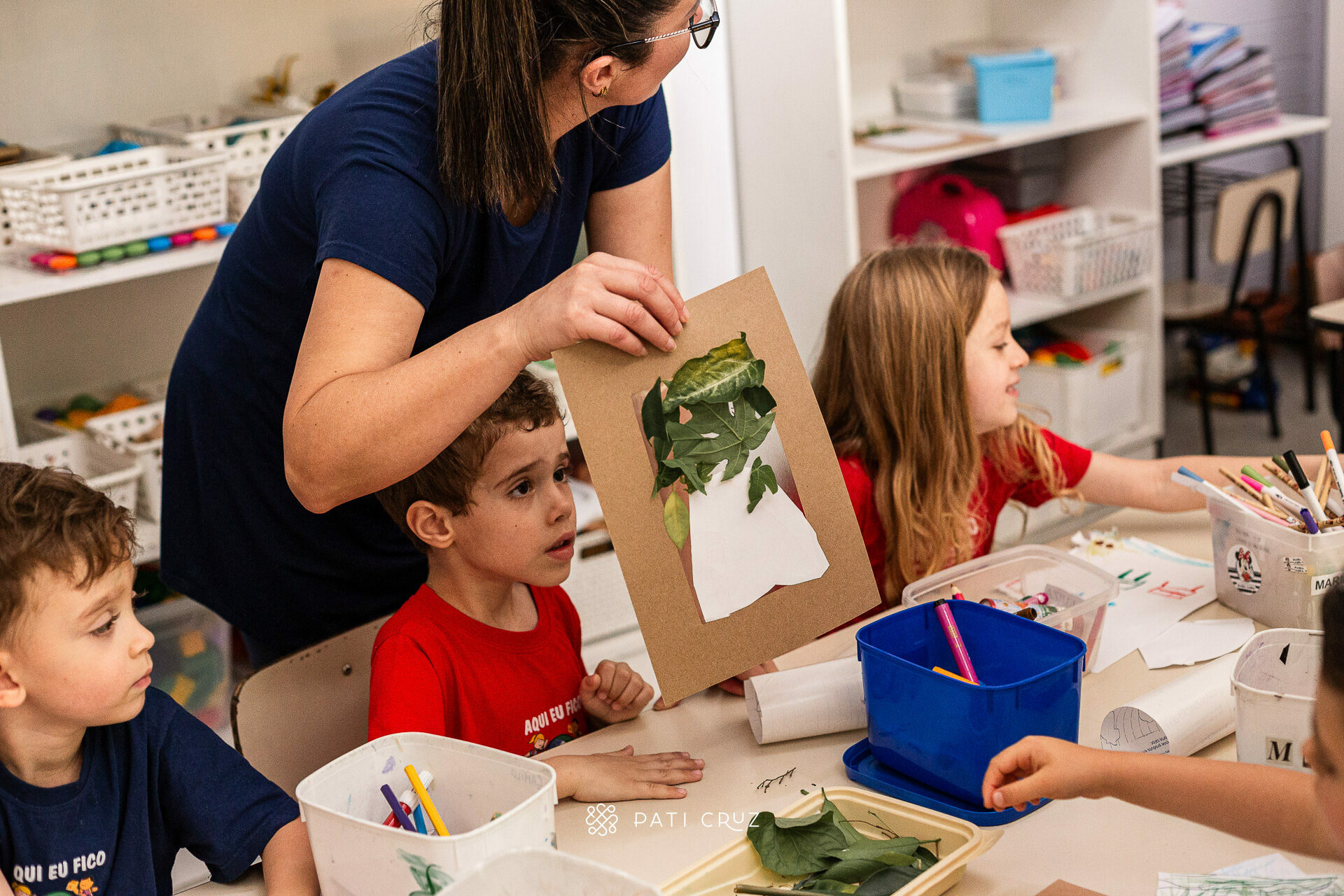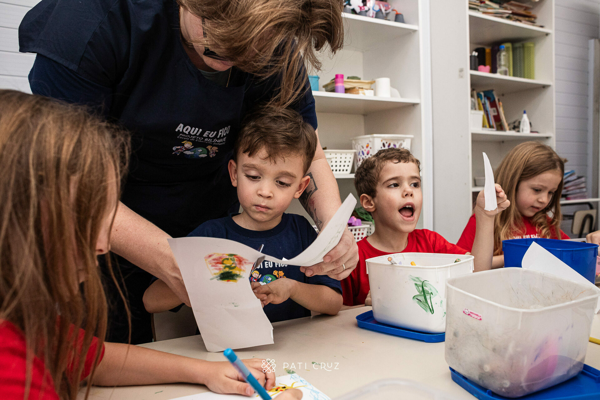 Pela manhã, as crianças ocuparam cada cantinho da escola com energia que só elas sabem ter. Entre pincéis, tintas e folhas enormes, cores escorreram pelas pequenas mãos, criando obras que traduziram a liberdade de imaginar.