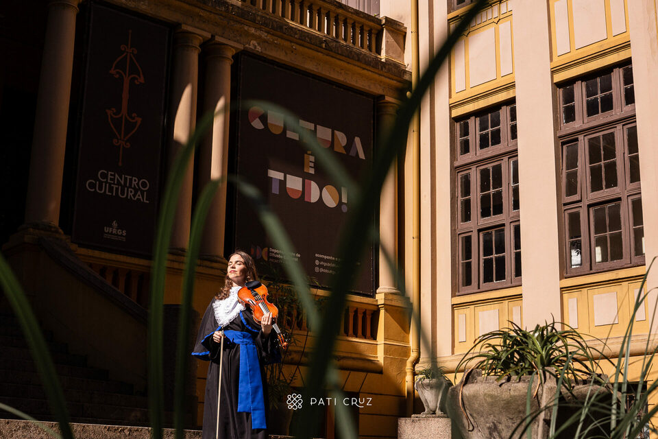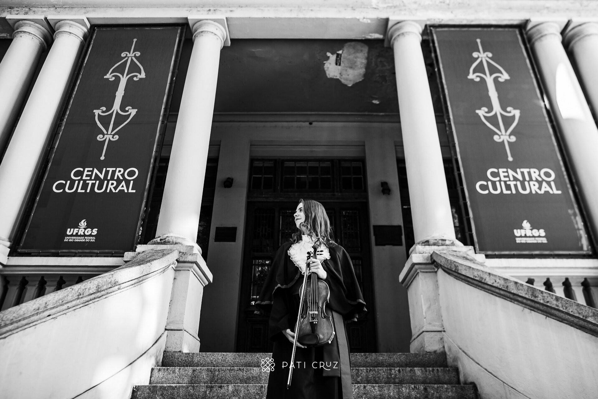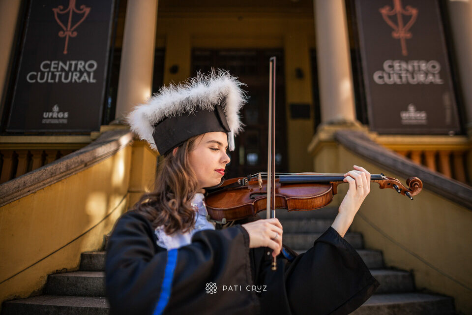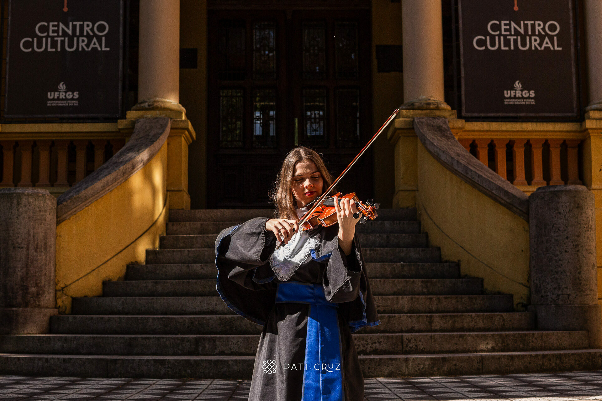 Escolhemos a UFRGS não apenas como cenário, mas como personagem. Entre árvores centenárias, corredores históricos e salas que já receberam incontáveis melodias, a formanda reviveu parte de sua trajetória acadêmica. Do som dos pássaros nas árvores ao som do violino, foi um fim de tarde incrível!
