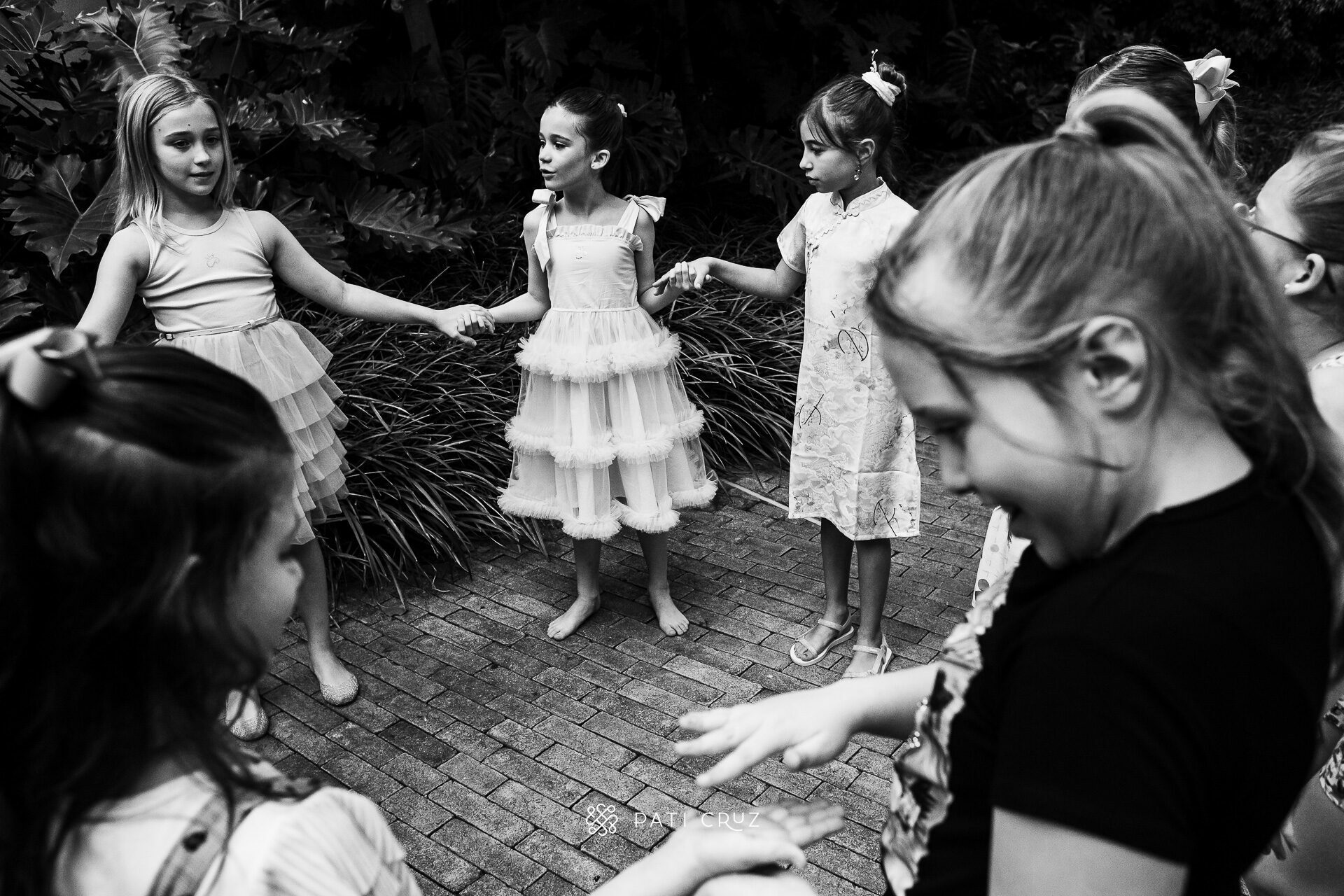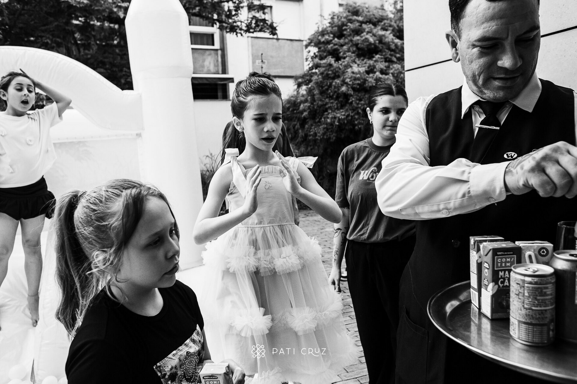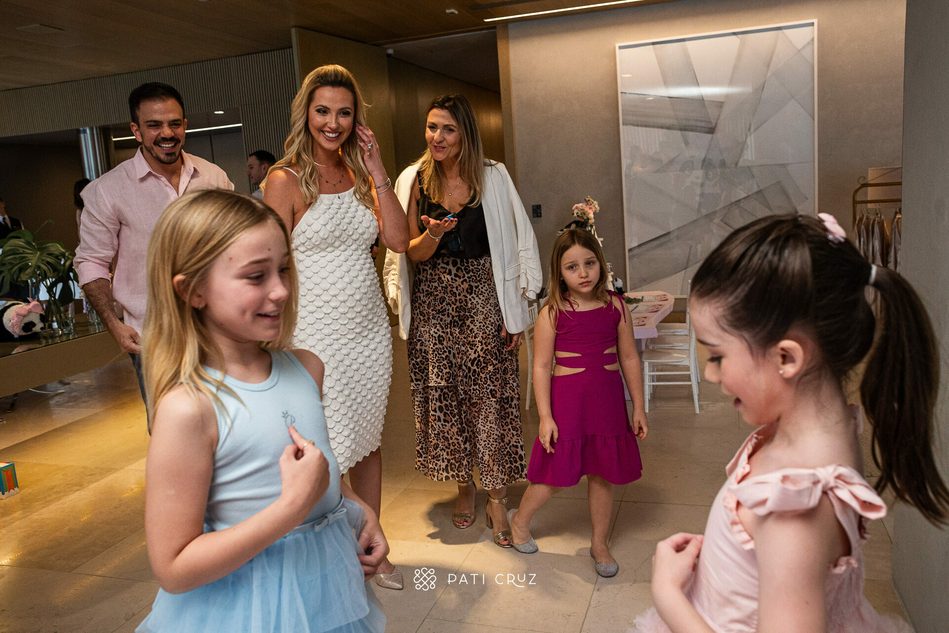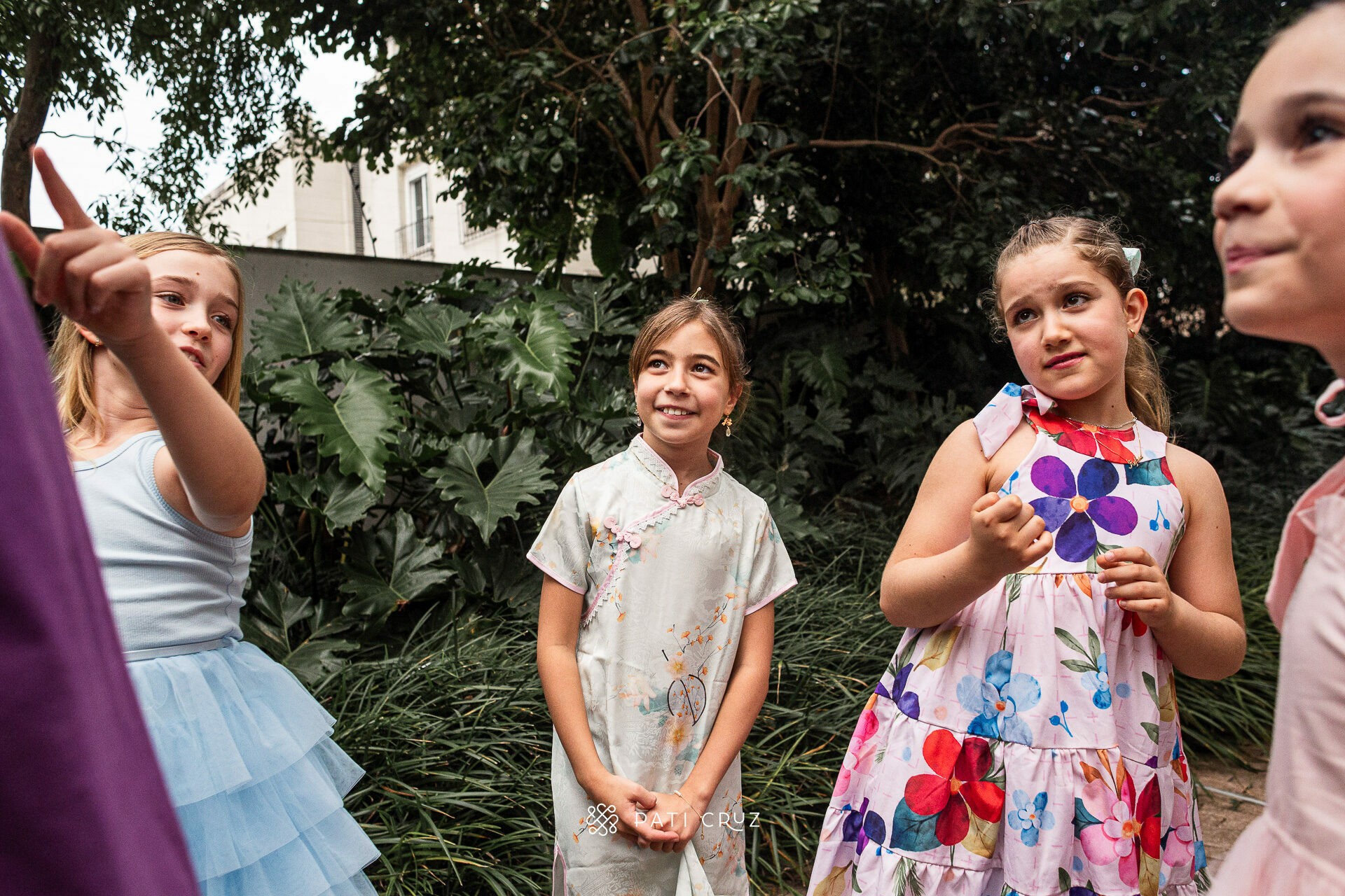 Eu comecei os registros com fotos posadas da Alice com a família no jardim, aproveitando a luz natural e os sorrisos ansiosos. Logo depois, as amigas começaram a chegar, dando início a uma tarde cheia de alegria!