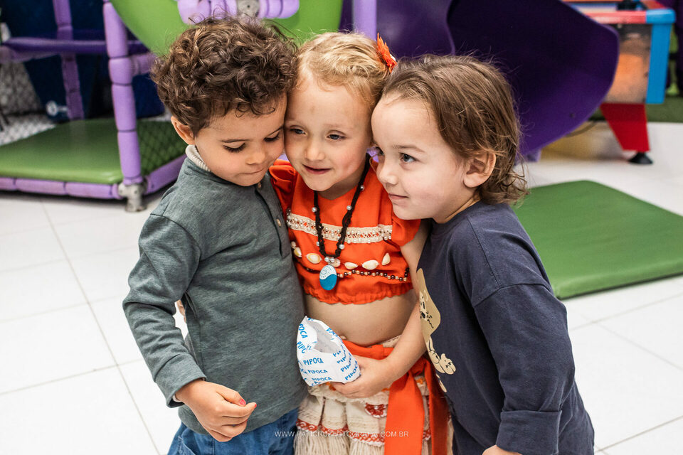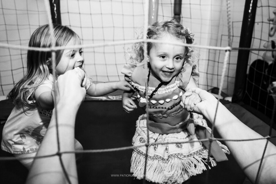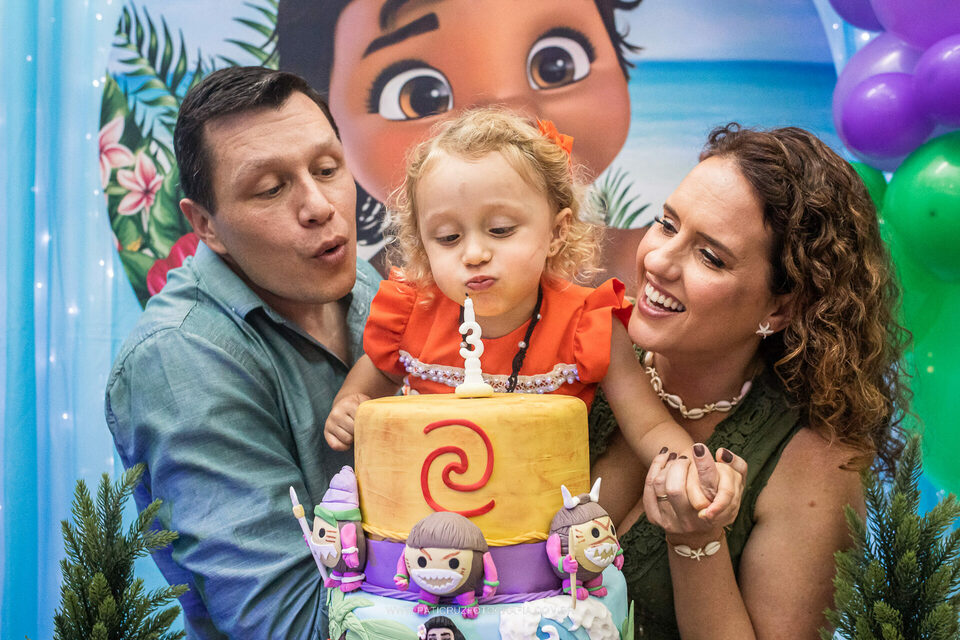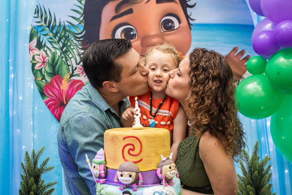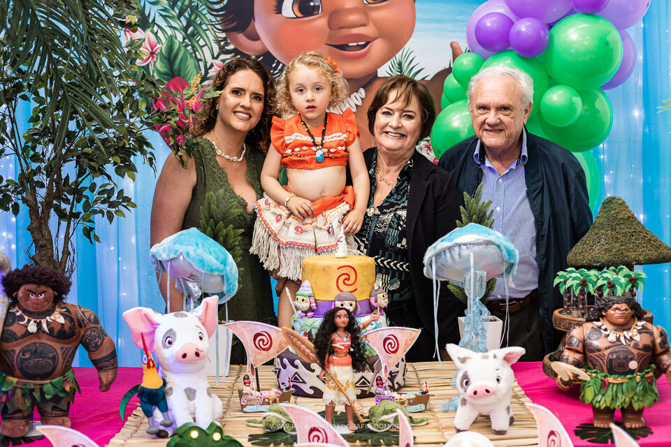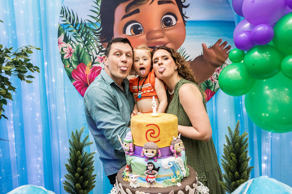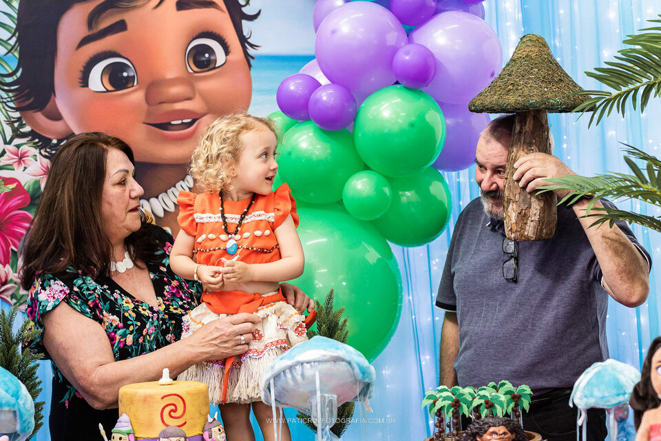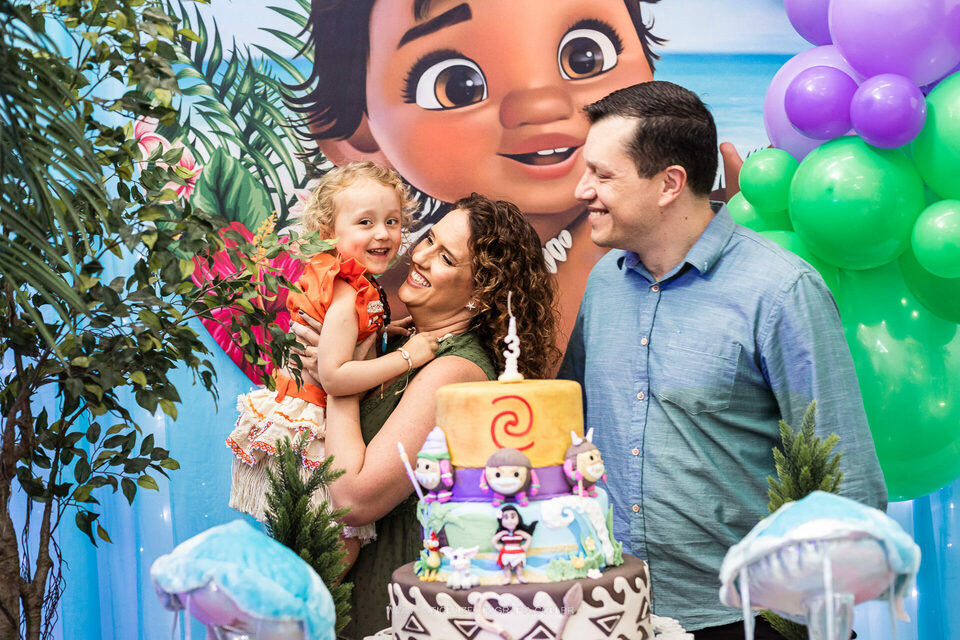 A festa de 3 anos dela foi a primeira festa grande que ela teve, e os pais escolheram como local para comemorar a casa de festas Mr. Bimbo, em Porto Alegre. O tema da festa foi escolhido pela própria Sofia e, ao meu ver, não poderia estar mais adequado à fase que ela está vivendo no momento: Moana, um mar de aventuras. A aventureira Sofia explorou cada cantinho da Mr. Bimbo e desafiou seus próprios limites. Caiu no tombo legal que deve ter umas 3x a altura dela (e adorou tanto que correu para ir de novo) e subiu no ponto mais alto do brinquedão que vai até o teto, de onde conseguiu ver a festa de cima e abanar para a mamãe Raquel, que orgulhosa olhava sorrindo para a filha lá longe. Pulou tanto na cama elástica que bateu o joelho e algumas lágrimas escorreram, mas nada que uns beijinhos, um colinho dos avós e um punhado de gelo não resolva, e em poucos minutos ela já estava correndo alegre novamente.