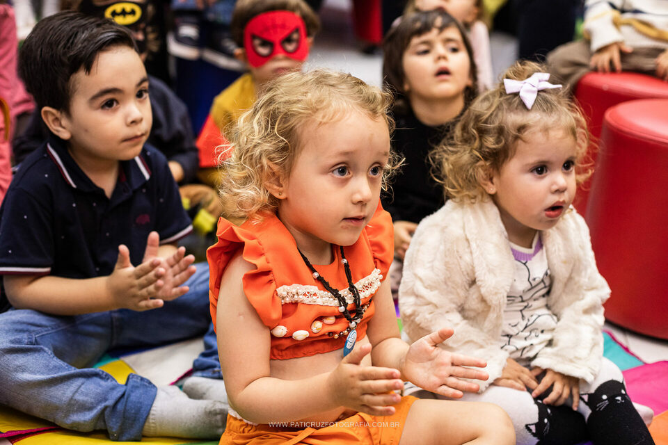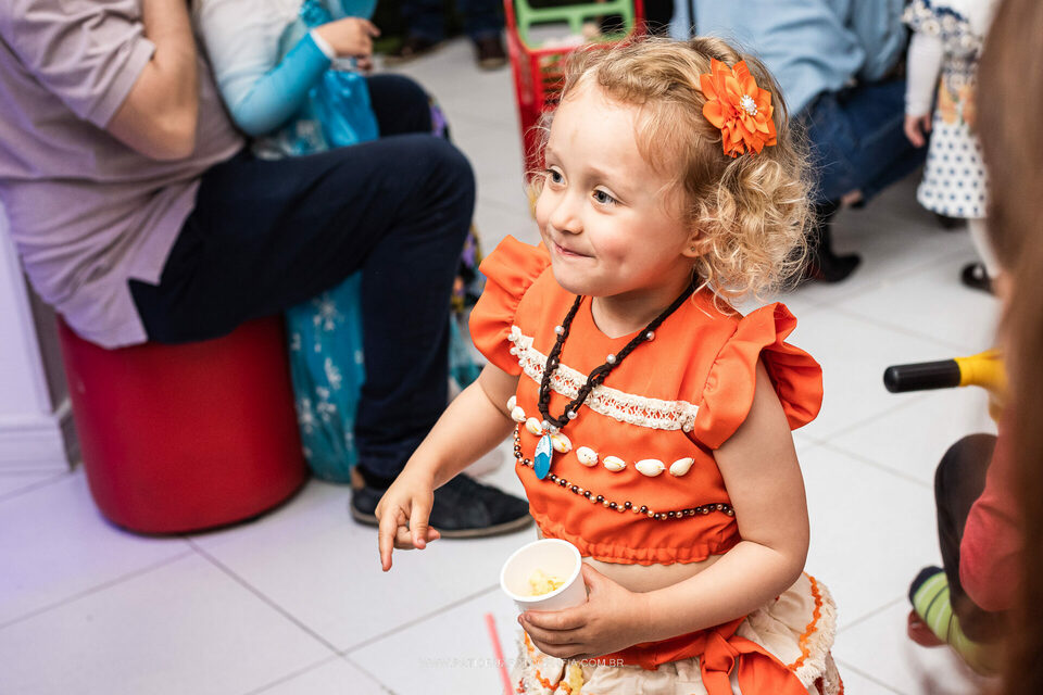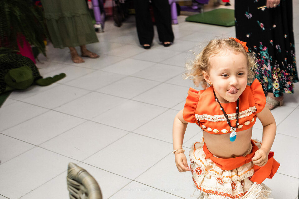 O traje lindo de moana foi carinhosamente confeccionado pela avó materna, que mora no Rio de Janeiro mas que desde o primeiro ano não perde uma festa da neta.