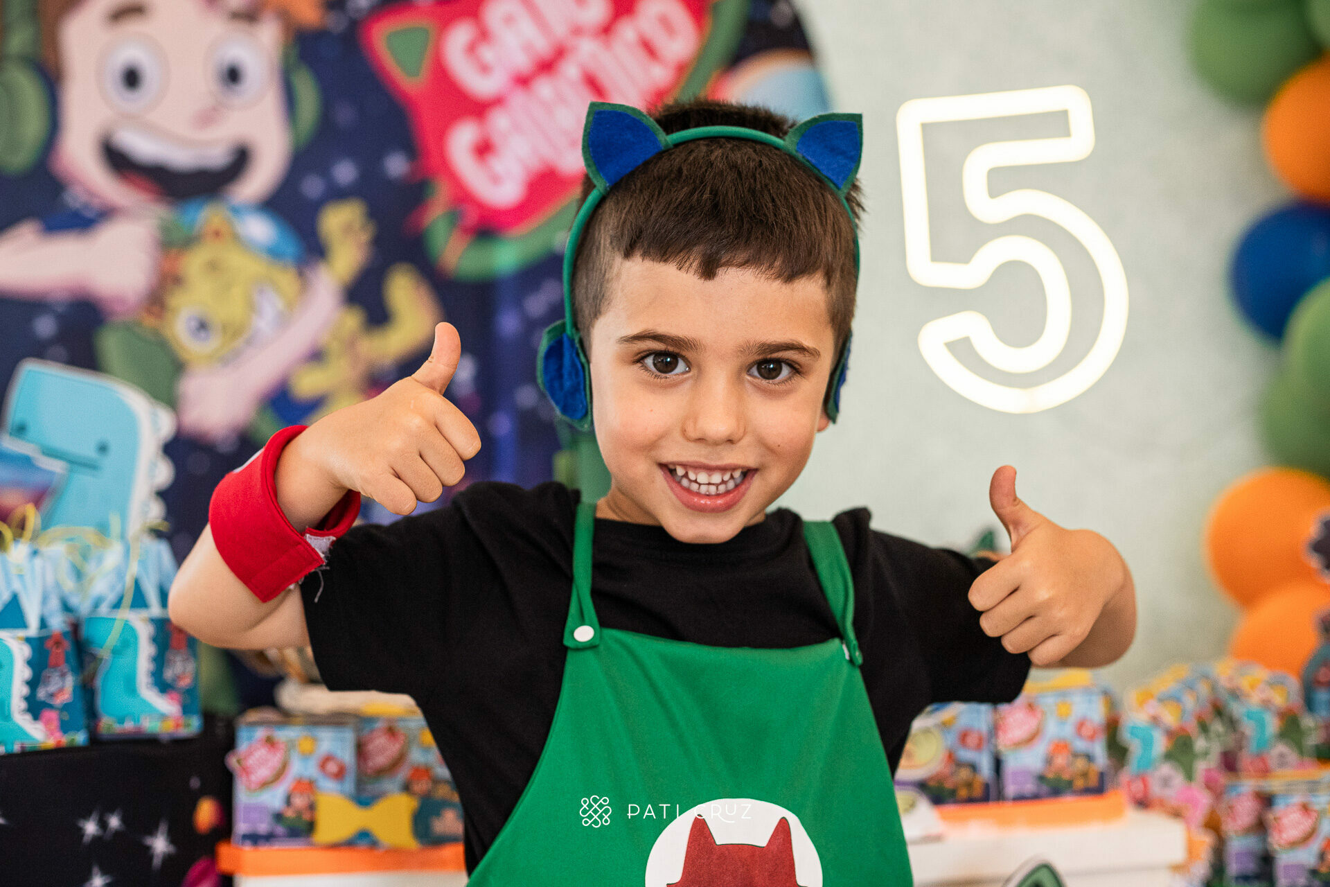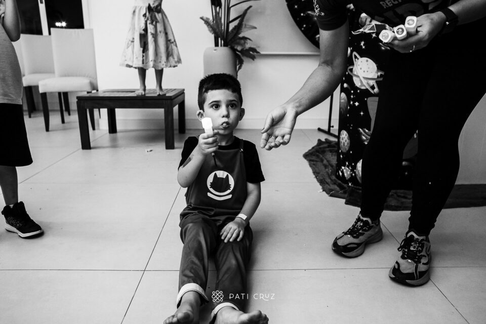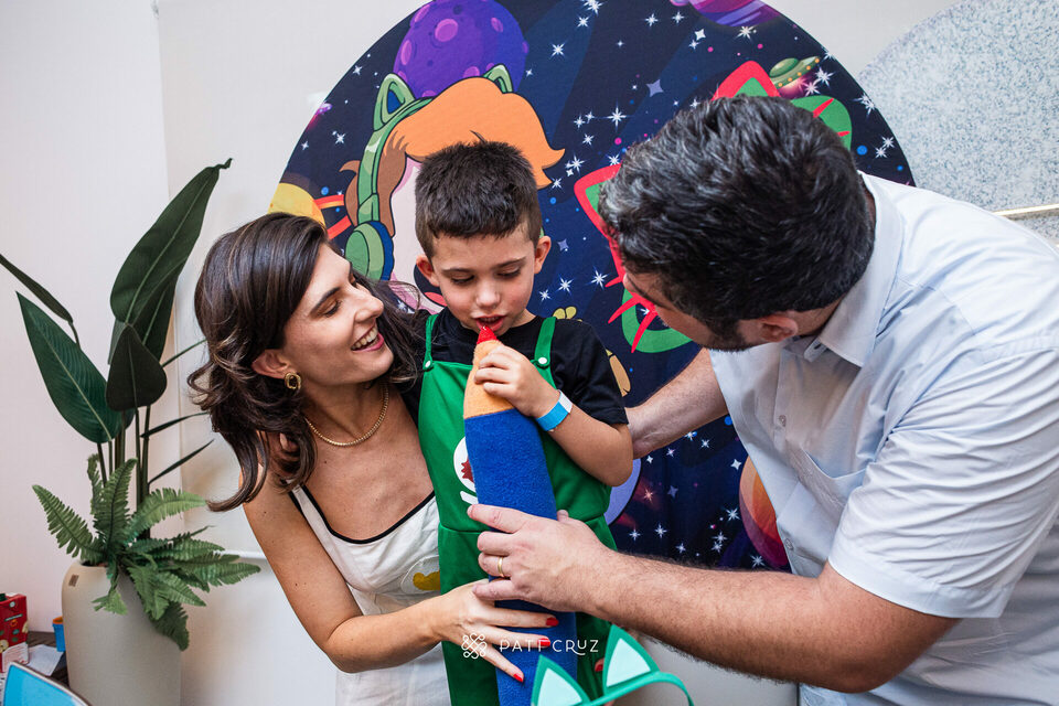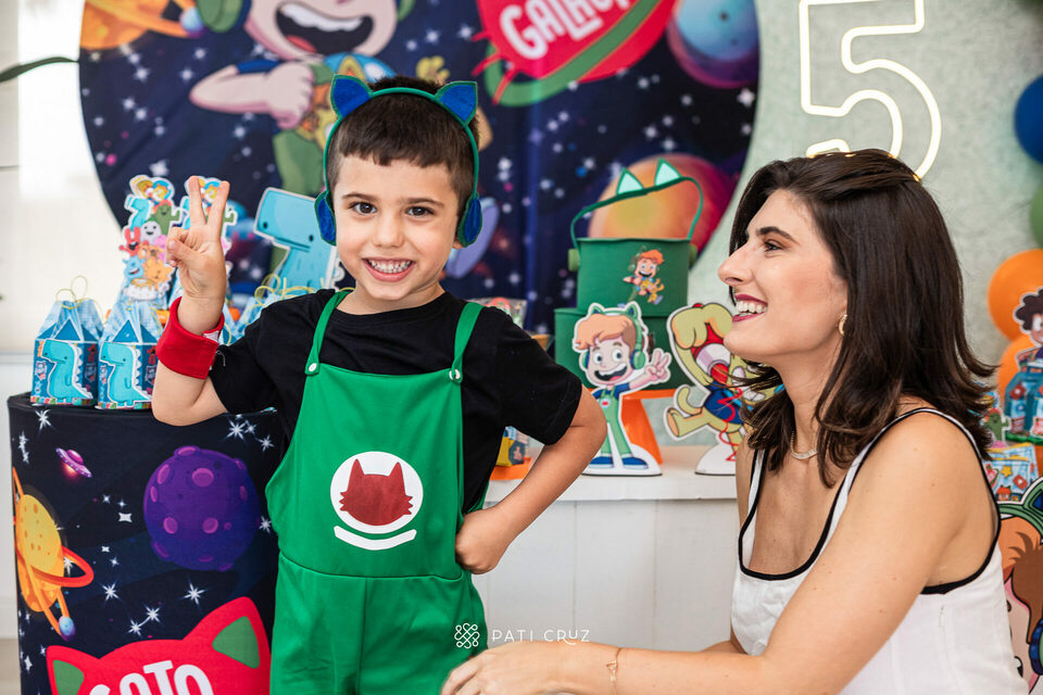 Quando cheguei, a festa ainda estava sendo preparada. Os brinquedos estavam em fase de montagem, a família cuidava dos últimos ajustes da decoração e dos detalhes dos comes e beber, enquanto o Gabriel já estava prontíssimo. Vestido com a roupa do tema escolhido por ele — o Gato Galáctico — demonstrava, em cada gesto, a ansiedade pela chegada dos convidados.