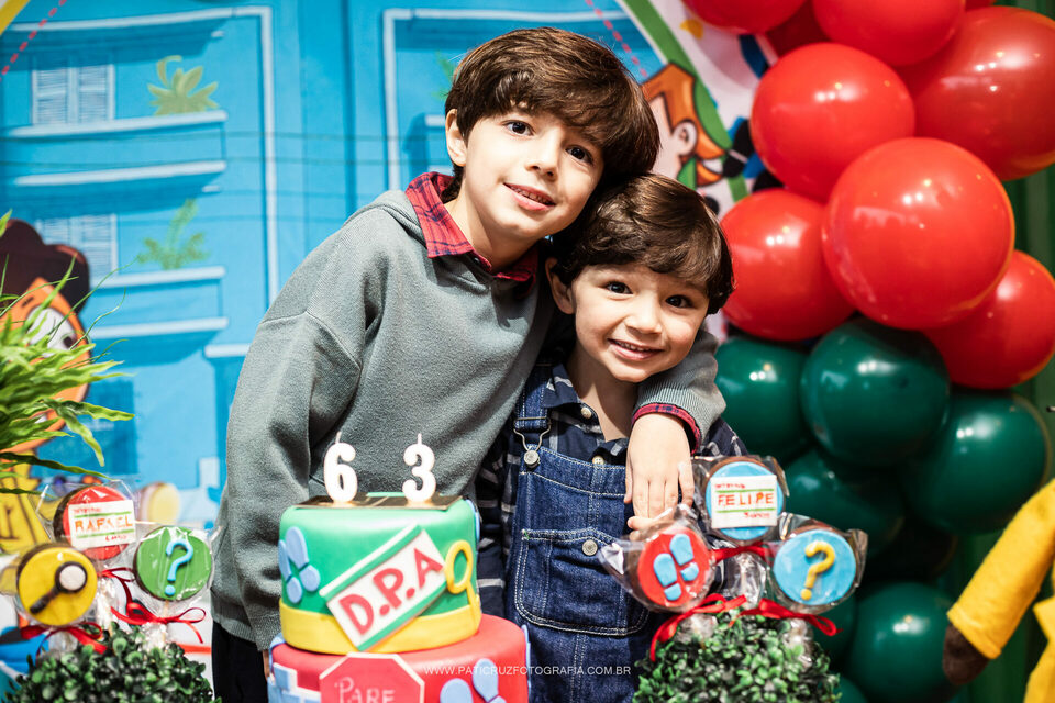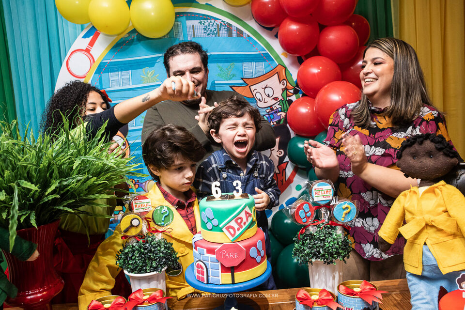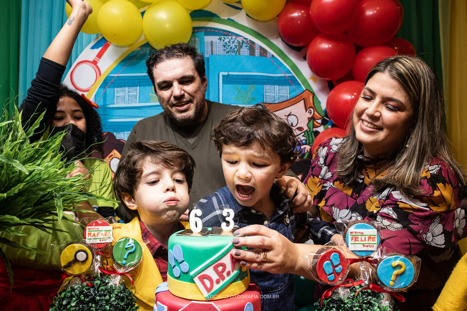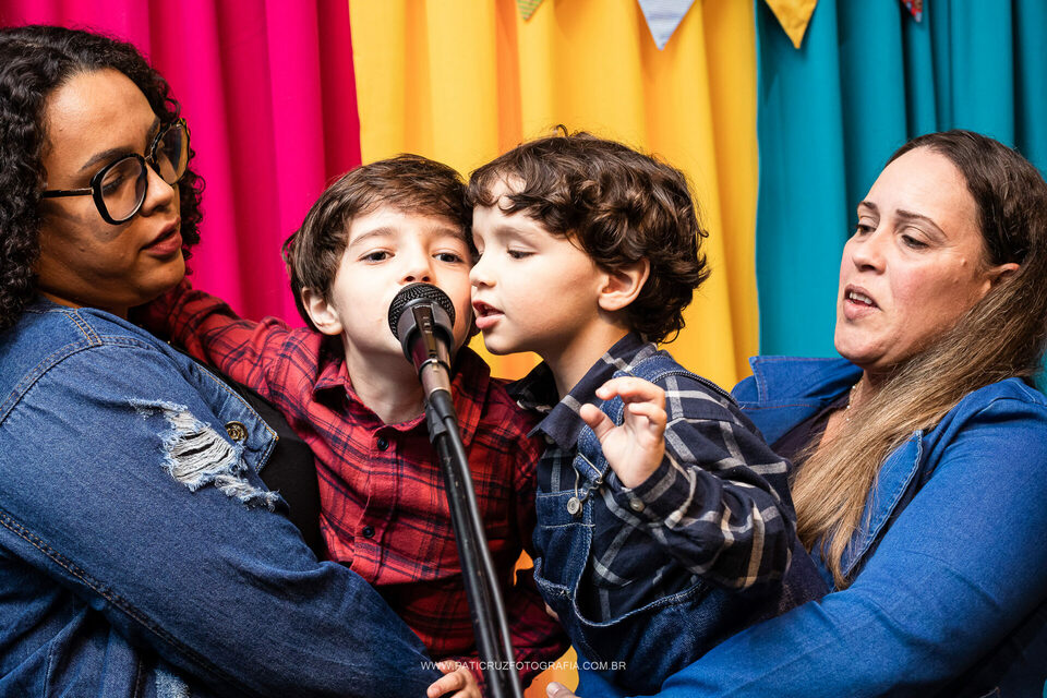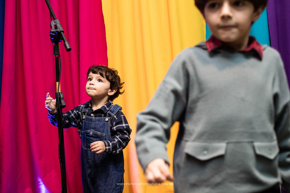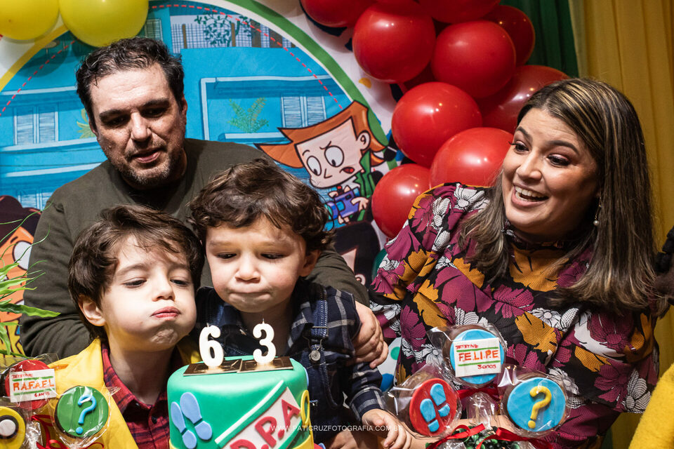Sempre que fotografo festa de irmãos é um desafio fazer os registros, pois tenho que me dividir e estar o tempo todo registrando um pouquinho cada um, afinal, ambos são protagonistas dessa história! Mas deu tudo certo, e consegui pegar momentos bem legais e inusitados, como a cantoria dos dois no microfone e a birra do Lipe no parabéns porque o Rafa apagou a vela dele.