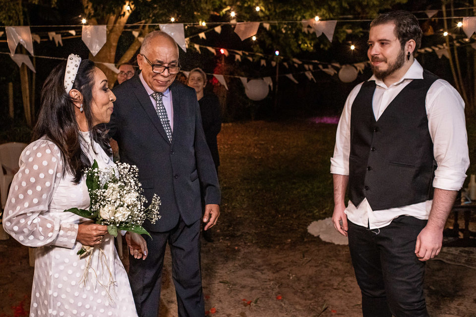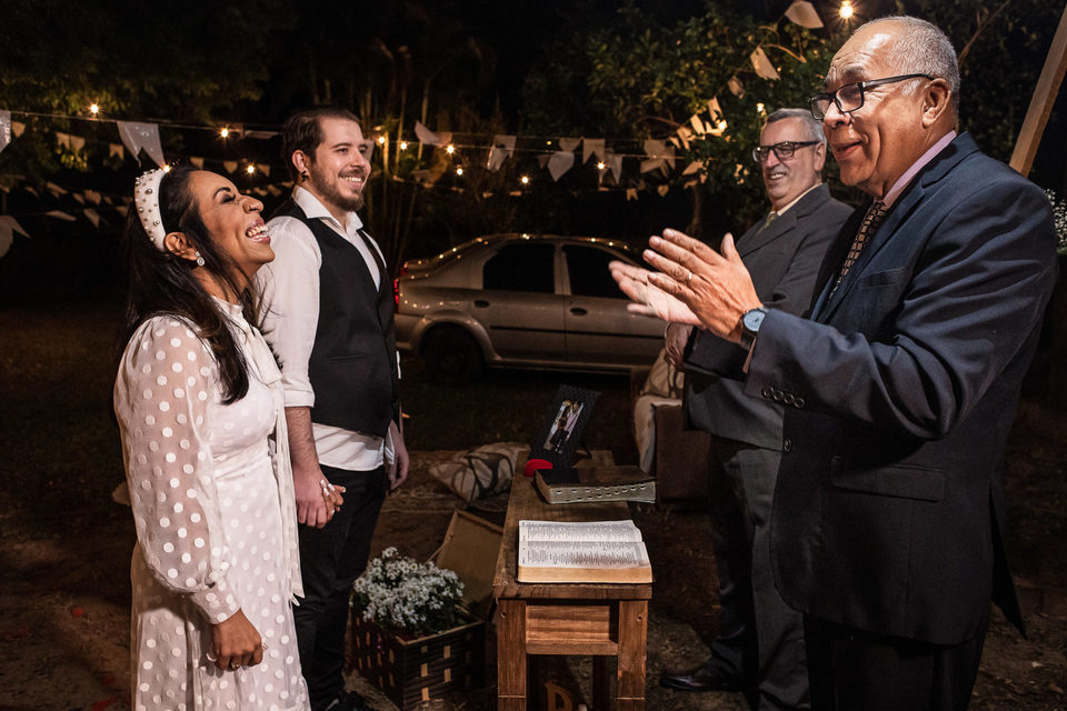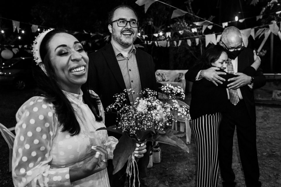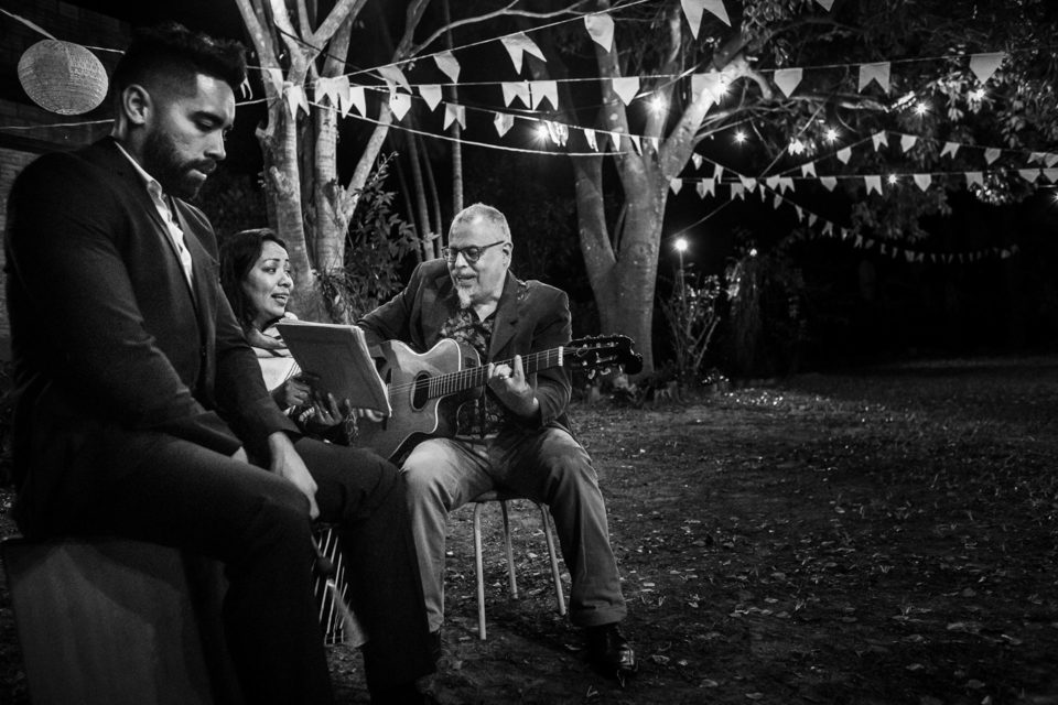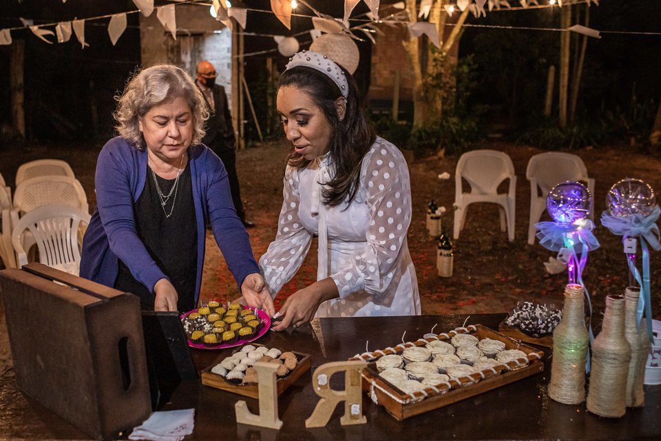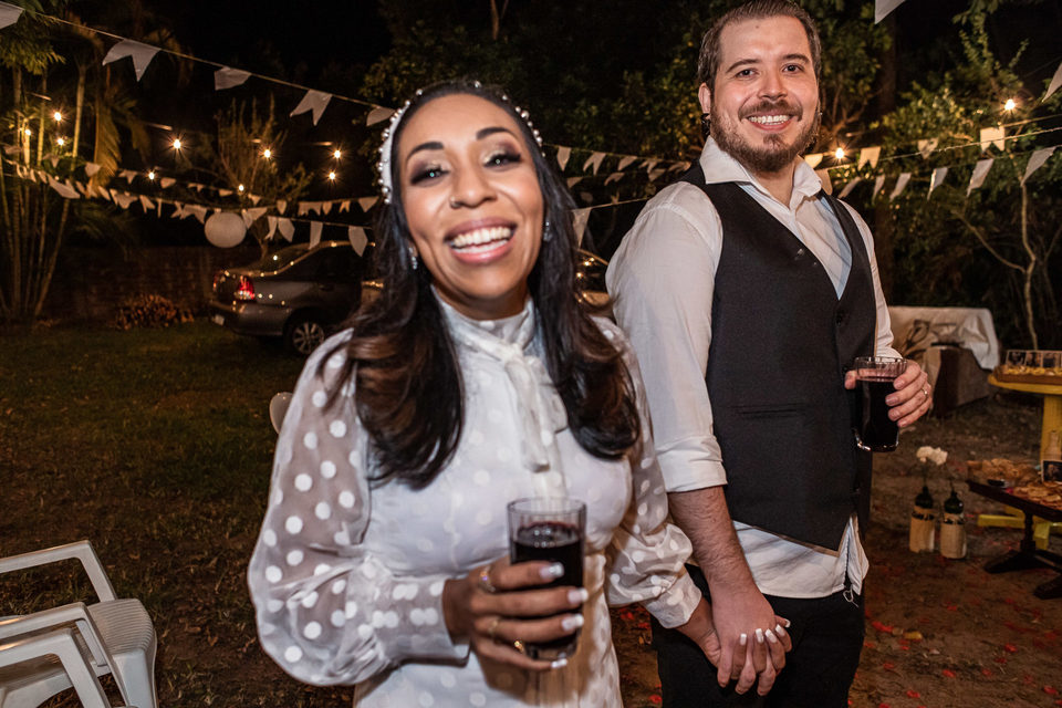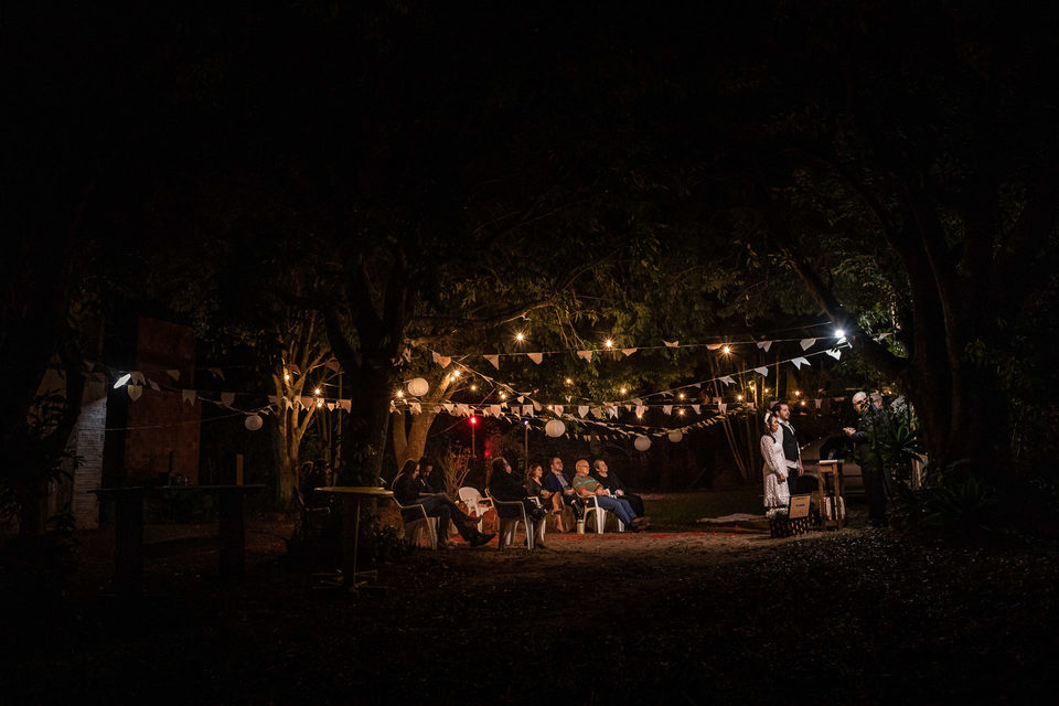 A comemoração seguiu com musica ao vivo tocada pelos irmãos e cunhado da noiva. A avó do Luccas prestigiou tudo da varanda da casa, bem agasalhada e protegida do sereno. Quando a festa terminou, novamente a família (de fé!) ajudou o casal na organização do espaço, recolhendo as luzinhas, guardando doces e salgados e carregando os móveis de volta para dentro de casa antes de irem embora.
