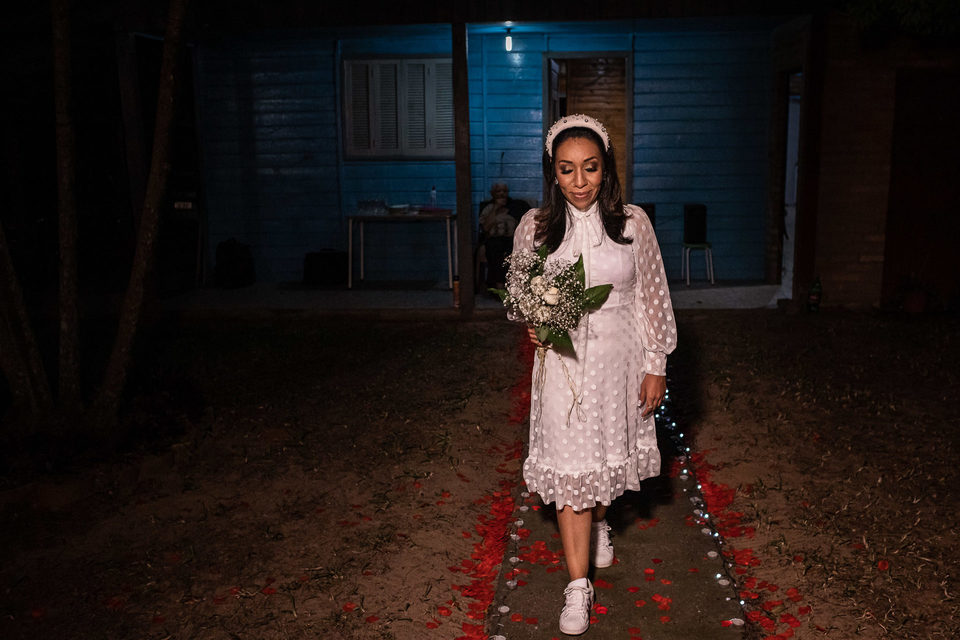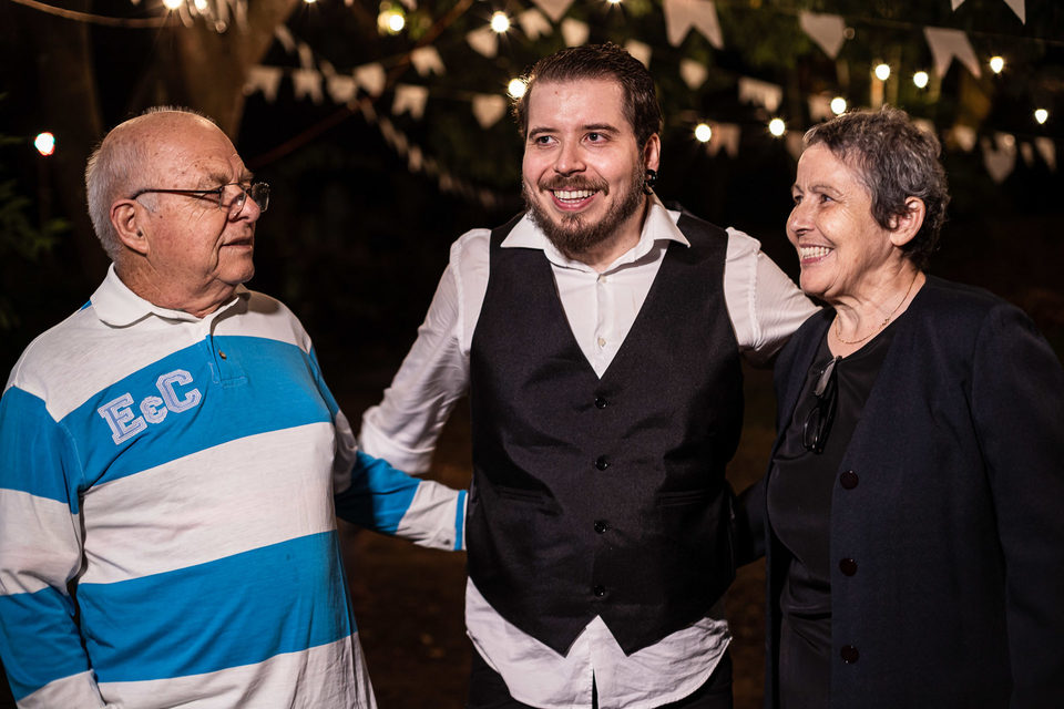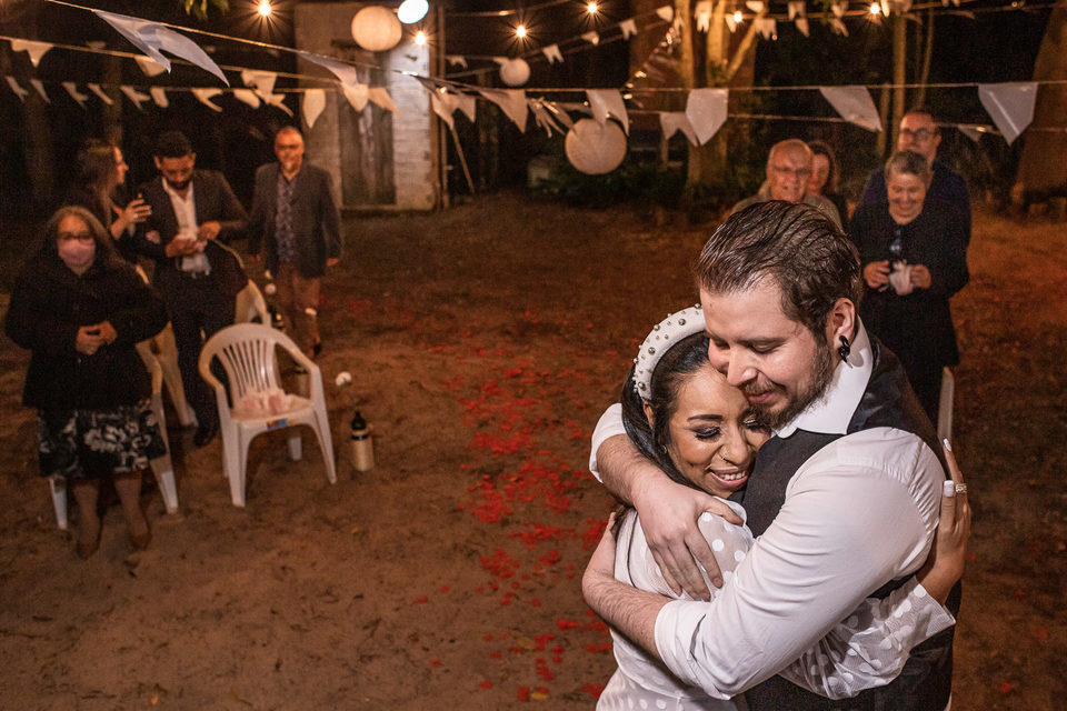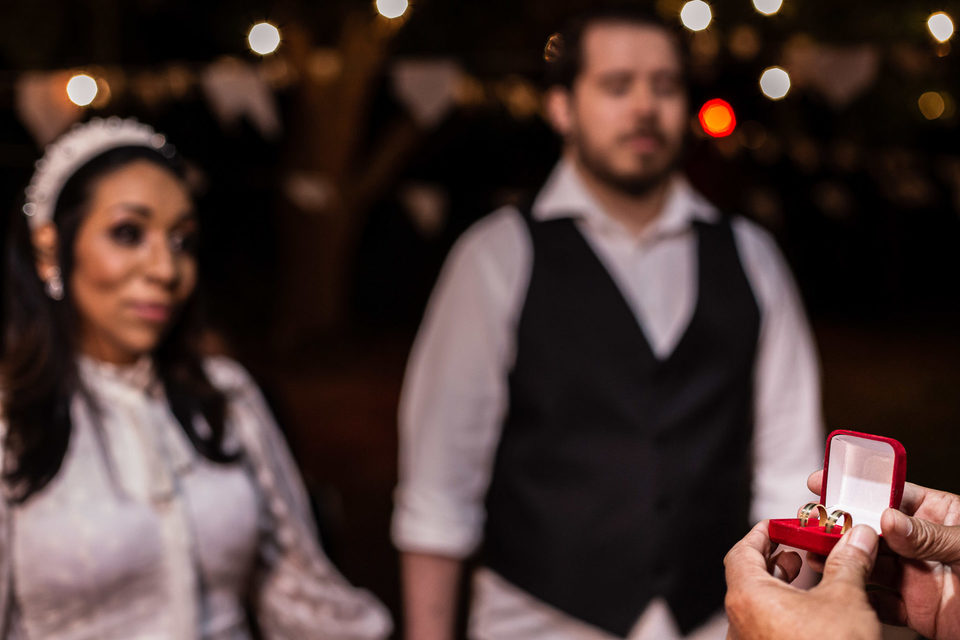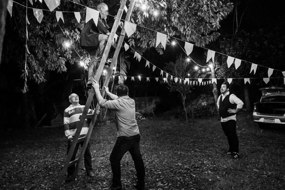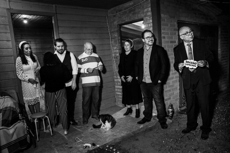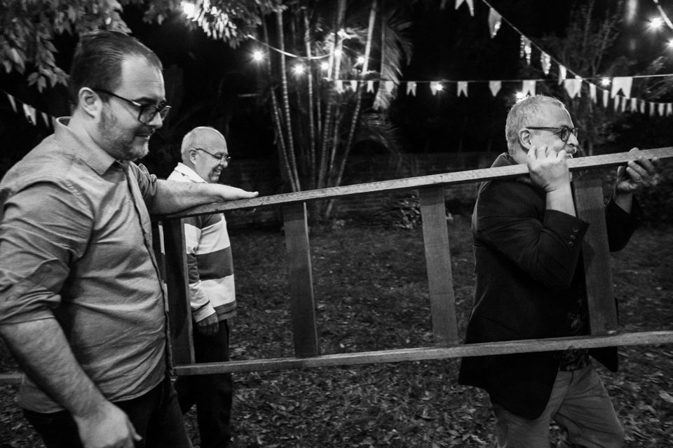 A comemoração seguiu com musica ao vivo tocada pelos irmãos e cunhado da noiva. A avó do Luccas prestigiou tudo da varanda da casa, bem agasalhada e protegida do sereno. Quando a festa terminou, novamente a família (de fé!) ajudou o casal na organização do espaço, recolhendo as luzinhas, guardando doces e salgados e carregando os móveis de volta para dentro de casa antes de irem embora.